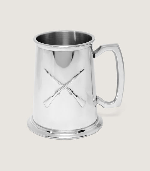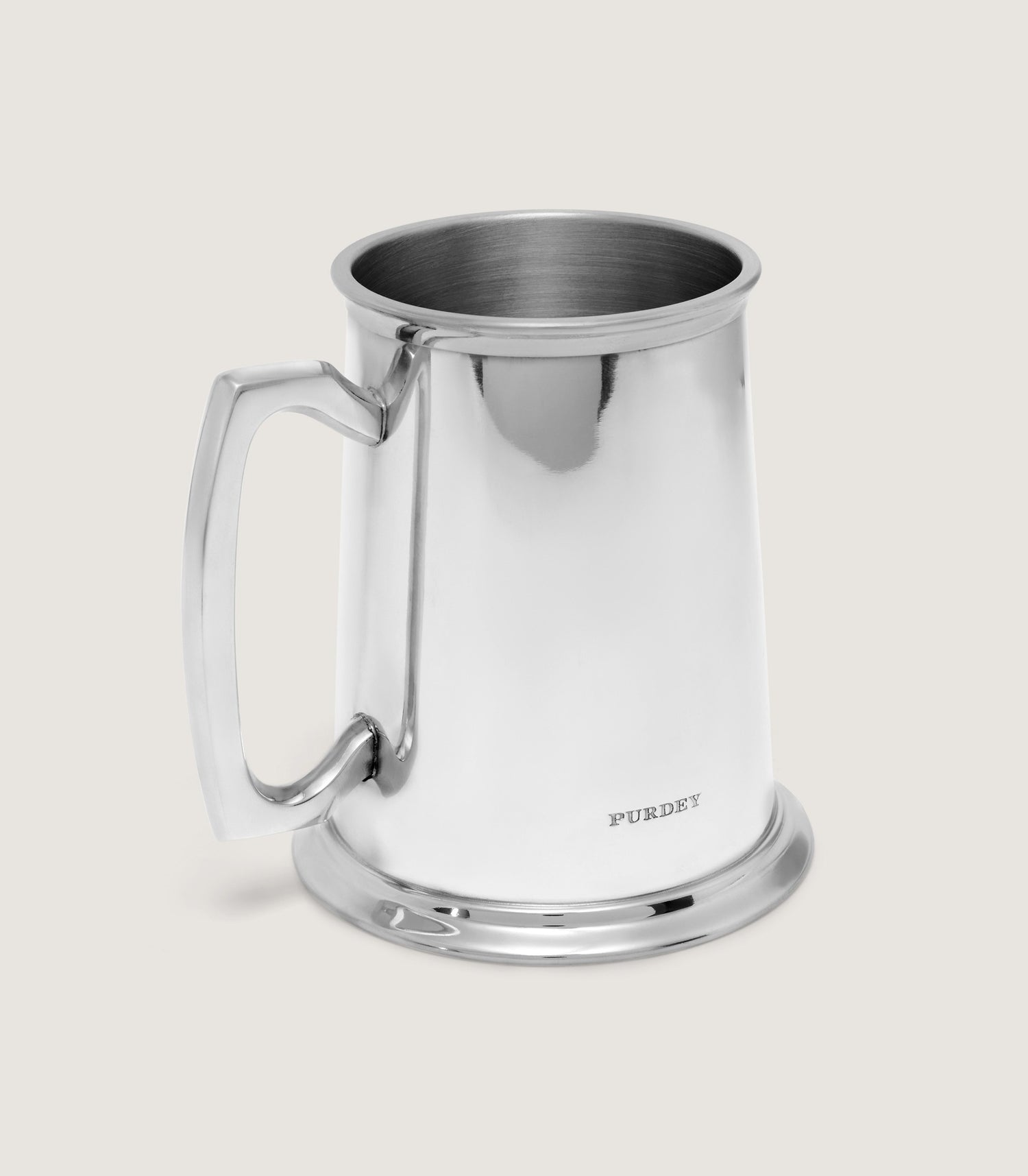 A one pint pewter tankard featuring Purdey touch marks, as well as Purdey cartridge cap engraving. 12cm x 10.5cm (not including handle). Made in England.