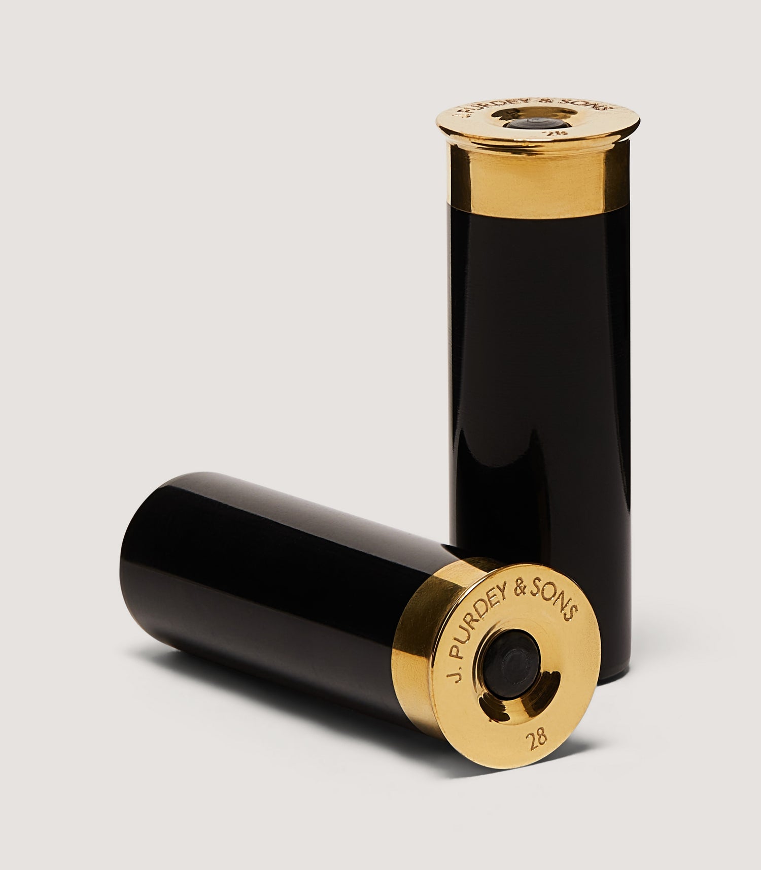 A pair of nylon and brass snap caps engraved with 'J. Purdey & Sons'. Available in 12-, 16-, 20-, 28-gauge and .410 barrels.  Made in England.