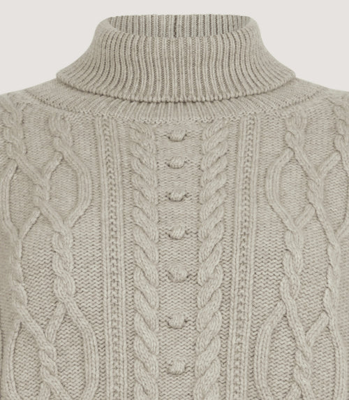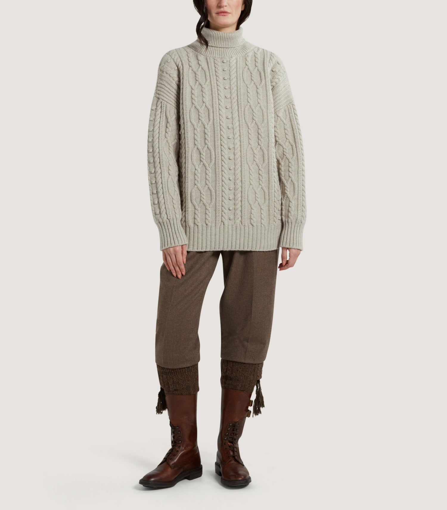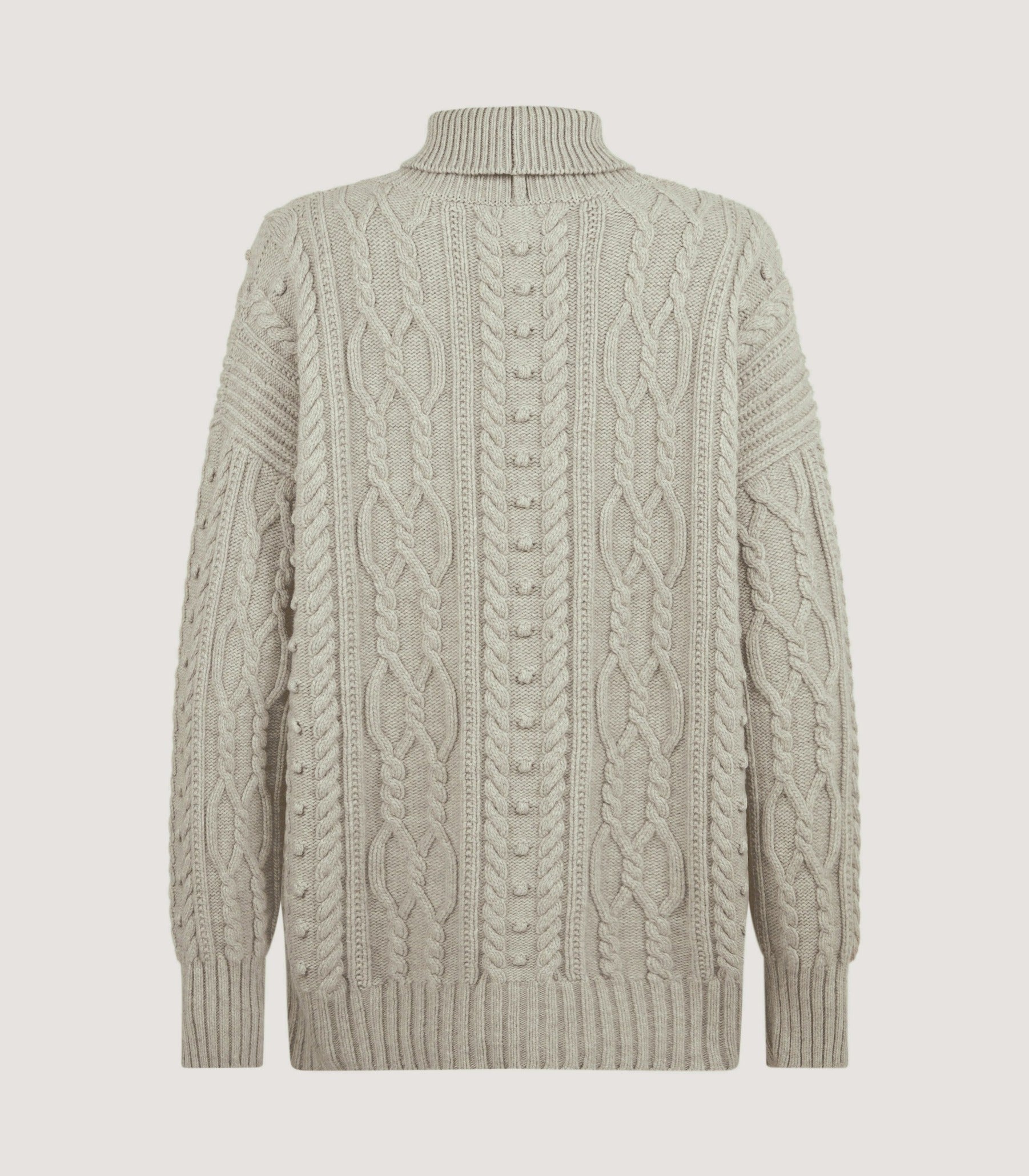 Crafted from a luxurious cashmere blend, this oversized oat-coloured rollneck offers unparalleled warmth and coziness for winter, distinguished by intricate knitting patterns inspired by the rich heritage of the Aran Islands.