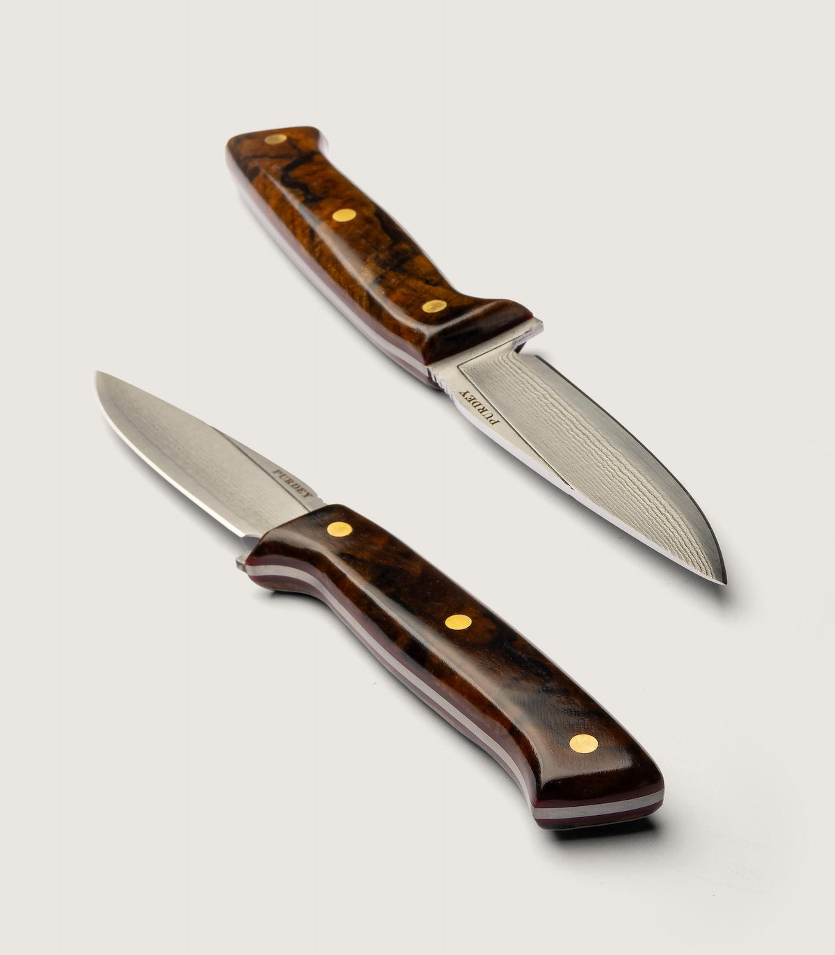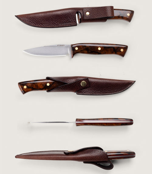 Crafted using CNC milling, allowing for blade geometries that are impossible via conventional blade manufacture. Each blade small batch hardened (no more than a dozen at a time) to ensure an optimal hardness of 60HRC. The blades are made from Takefu 67-layer San Mai, with a VG10 core. VG10 is arguably one of Japan's finest stainless knife steels. Each blade is individually etched in a mixture of hydrochloric acid and ferric chloride before being cleaned and buffed. The blade geometry allows for a substantial and rigid spine, with a concave blade profile leading to a razor-sharp cutting edge. The handles are created from authentic Purdey gunstock walnut, that has been pressure-reinforced with an epoxide polymer. The strip of Audley red that sets the handles apart consists of layered glass fibre. Each handle is shaped, sanded, oiled and finished by hand. The handle is secured using a combination of marine epoxy and custom rivets applied with a 2-tonne press. The sheaths are made in Devon from oak-tanned leather.