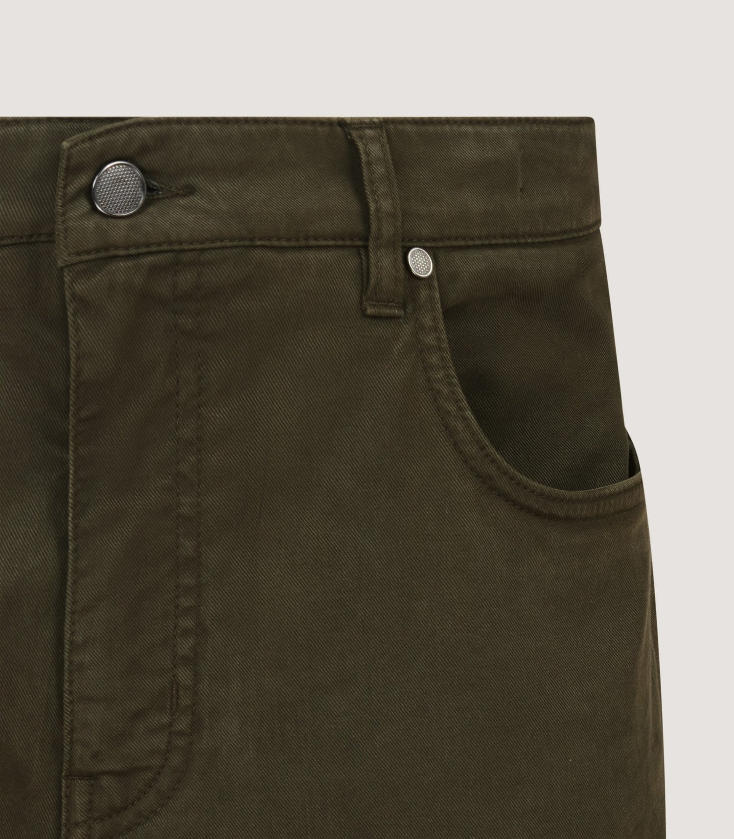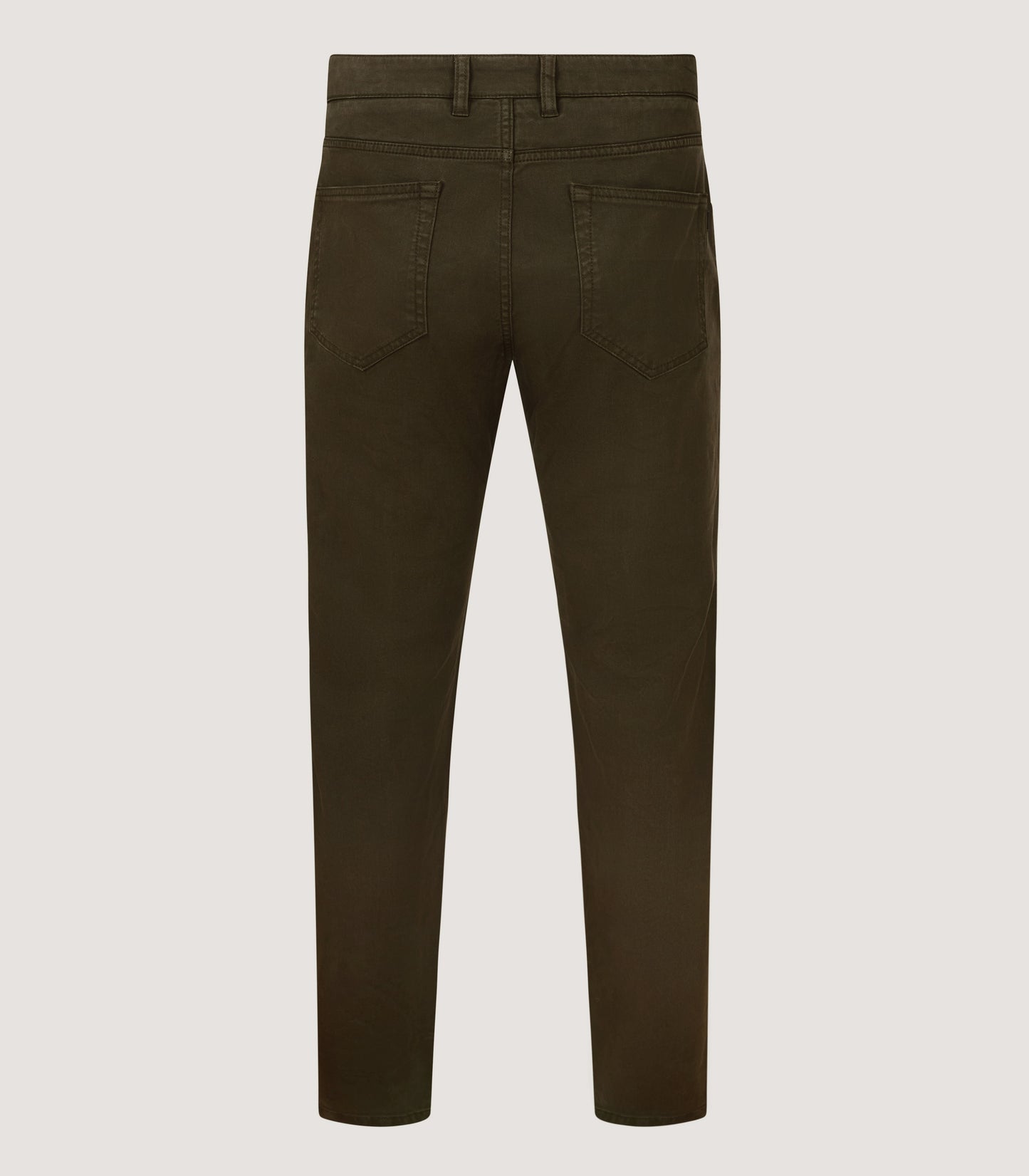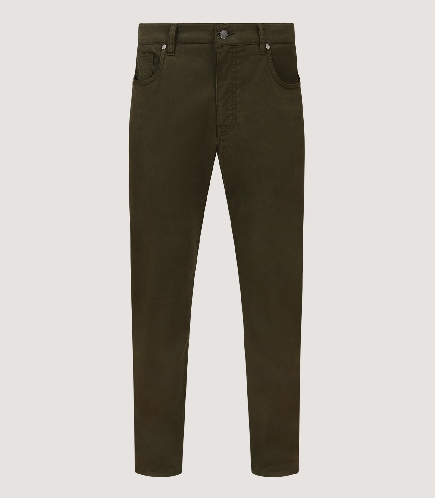 The Men's classic Five Pocket Trousers are made from lightweight stretch fabric in deep Forest Green, offering ease of movement. Designed with classic five-pocket styling and enhanced by signature chequered metal rivets, they bring a subtle update to a timeless design. The zip fly is finished with a chequered buttoned closure for a subtle yet distinctive touch, while the debossed leather tab on the back pocket adds a nod to heritage craftsmanship.