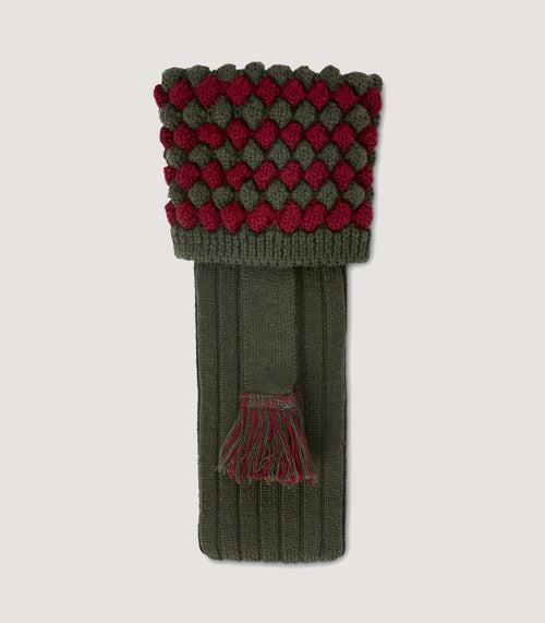 Good socks must be comfortable all day long. Ours are designed to be worn with breeks to ensure a perfect seal at the knee. The main body of the sock is ribbed with a richly textured three-dimensional cuff adding a distinctive flourish. These 100% pure merino socks come complete with garters.