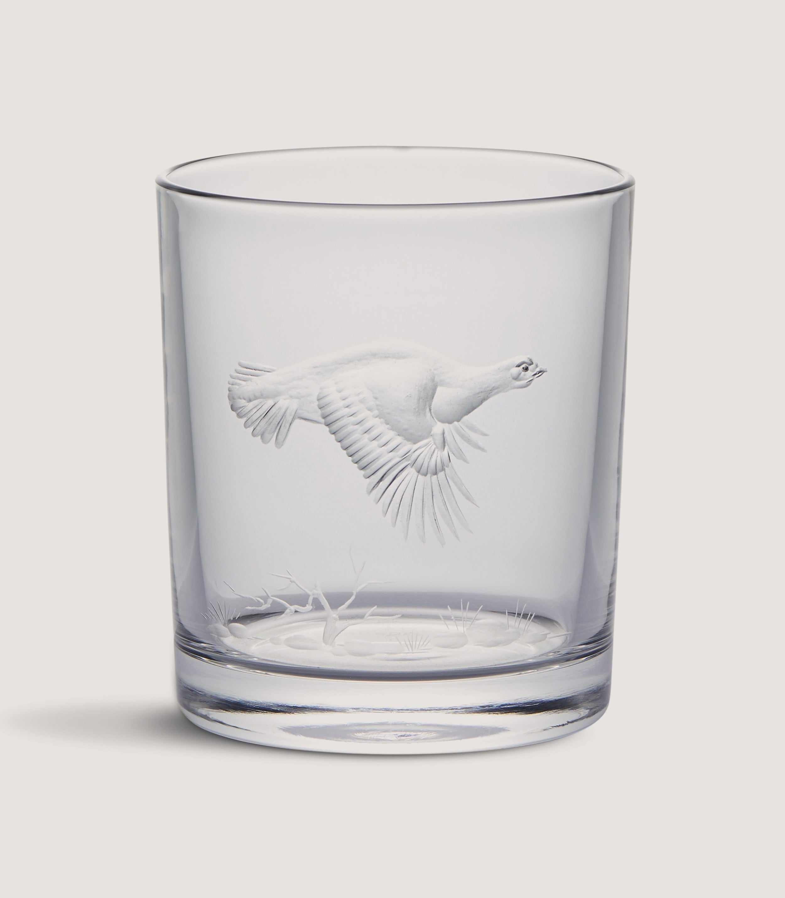 A crystal tumbler, intricately engraved by a master craftsman with a flying grouse. 'Copper wheel' is the most demanding of all engraving processes and is particularly suited to pictorial subjects as the three dimensional and tactile surfaces convey both depth and form.  Made in the UK.