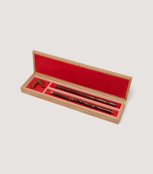 This one of a kind  wood stick comes with a beautifully crafted wood travel case which has been made specifically for this stick.  Hand made in Northern Ireland the main body is made from oak with the lid in marquetry from American Black Walnut and Sycamore.  It has solid brass quadrant hinges.  It has embedded magnets hidden under Bog Oak to hold the lid in place.  Internally it is lined in faux suede and has internal dividers for the parts of the stick.