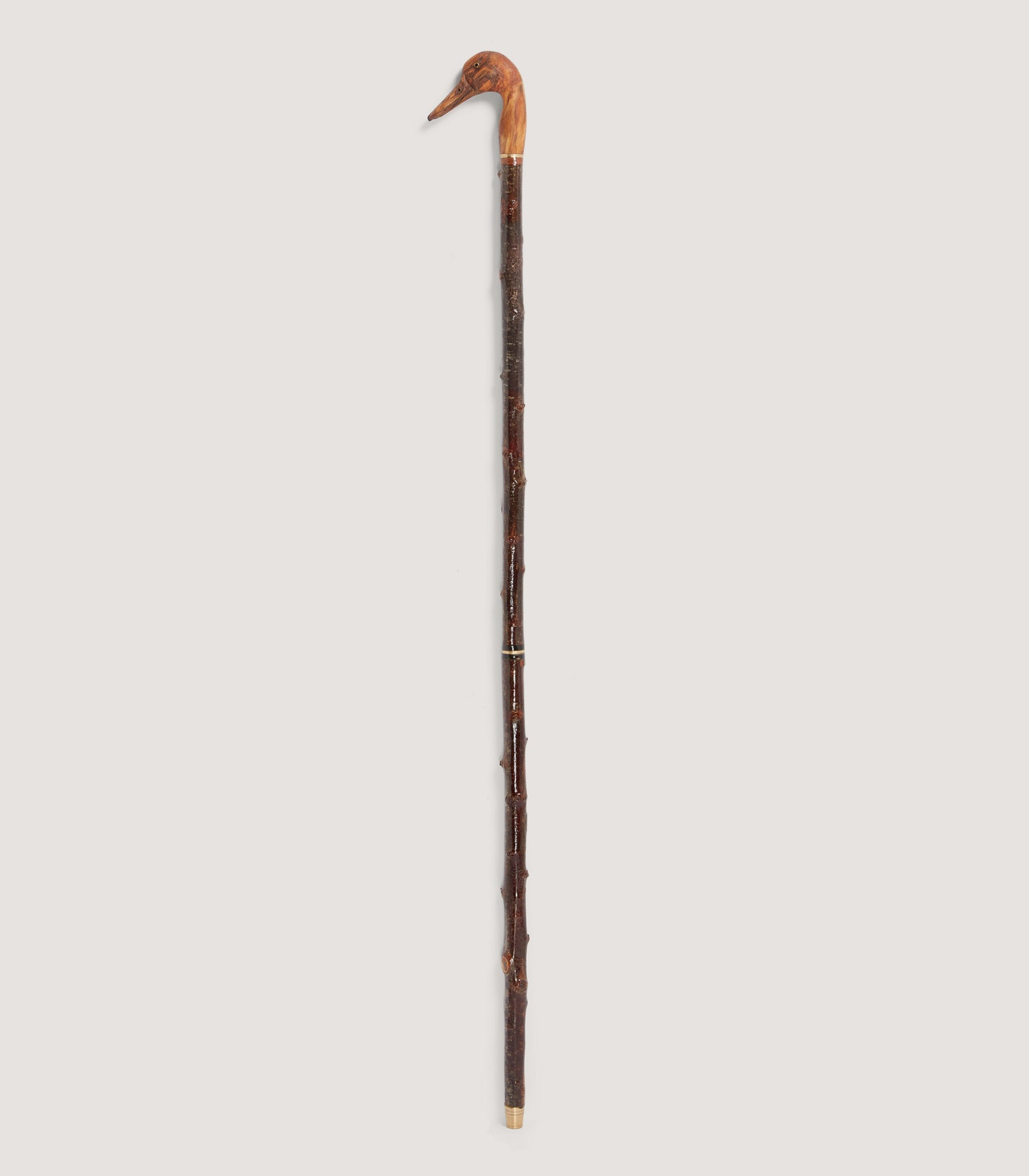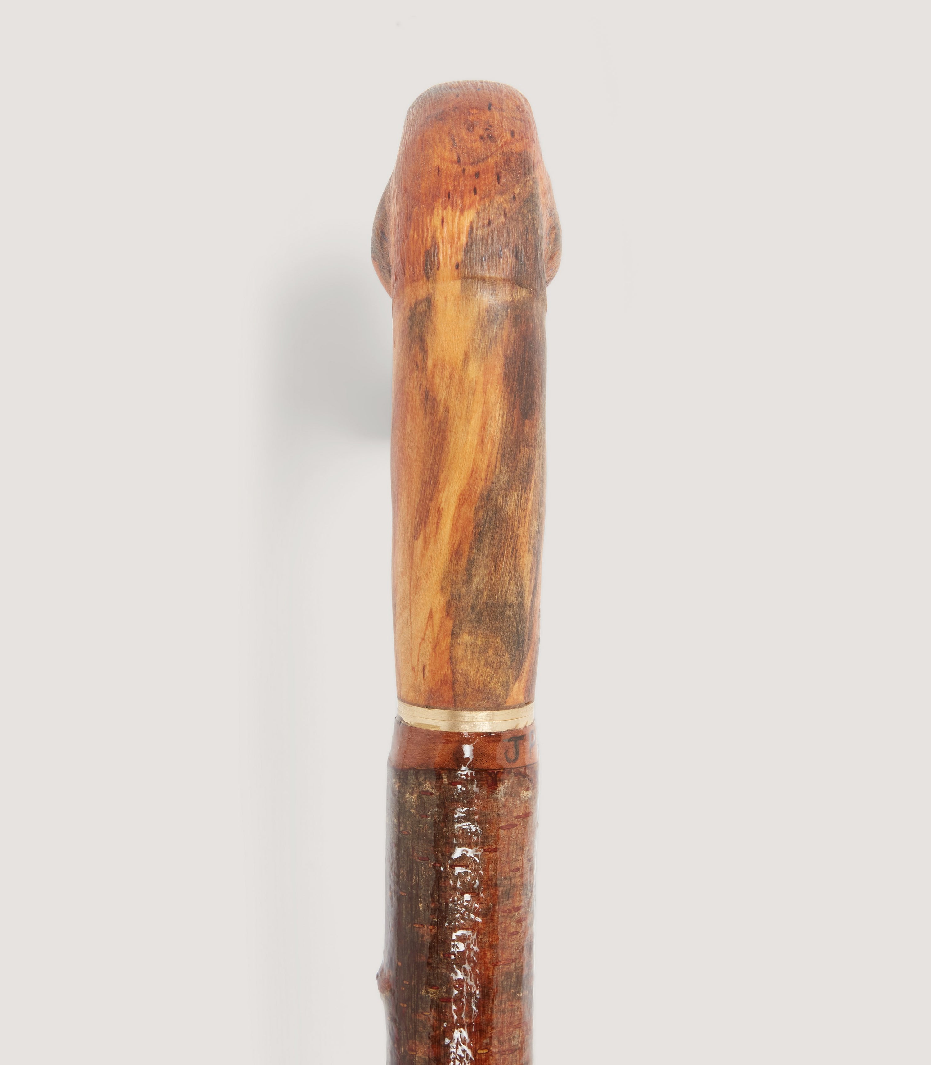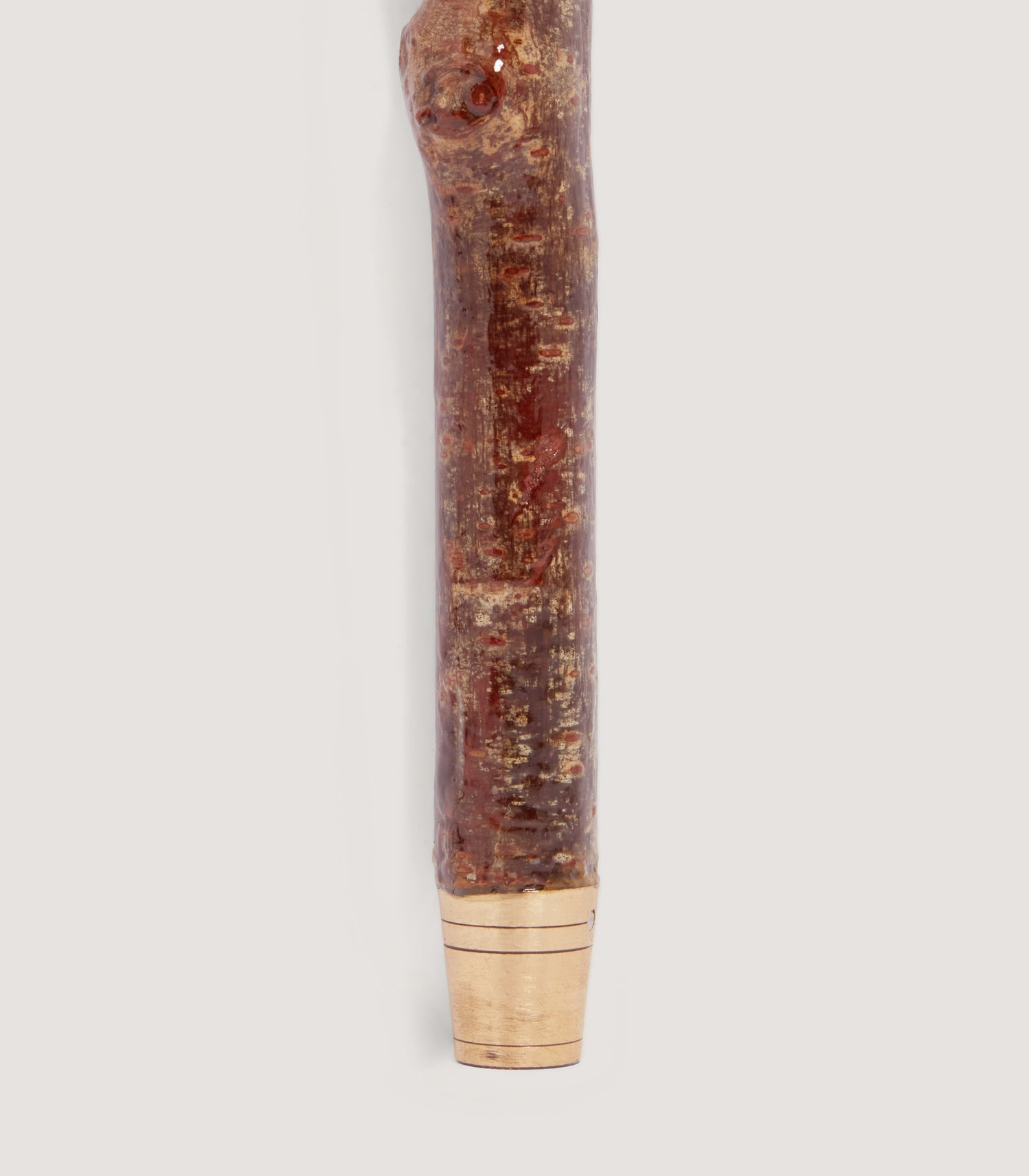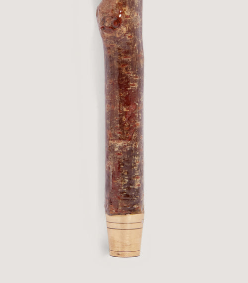 The head is carved from a spaltered Apple branch and has slight colouring with wood stain and dye.  The shank is formed from a Blackthorn branch.  The stick has a gunstock oil finish that enhances the look and also protects the wood from the elements.