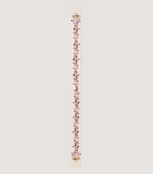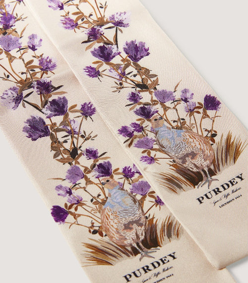 A 100% silk twilly, a long and narrow scarf that can be worn around your neck or in your hair or used to accessorise your tote, depicting the majestic partridge amongst flora. Measures 134 x 9cm.