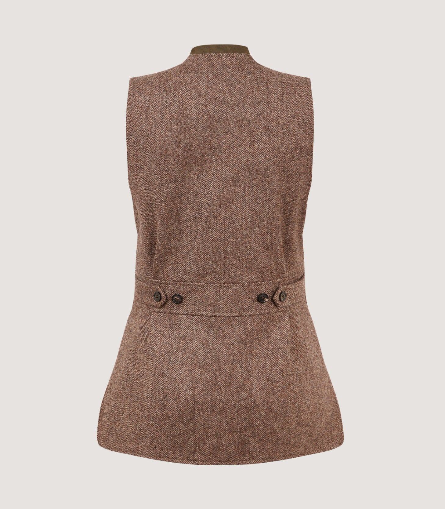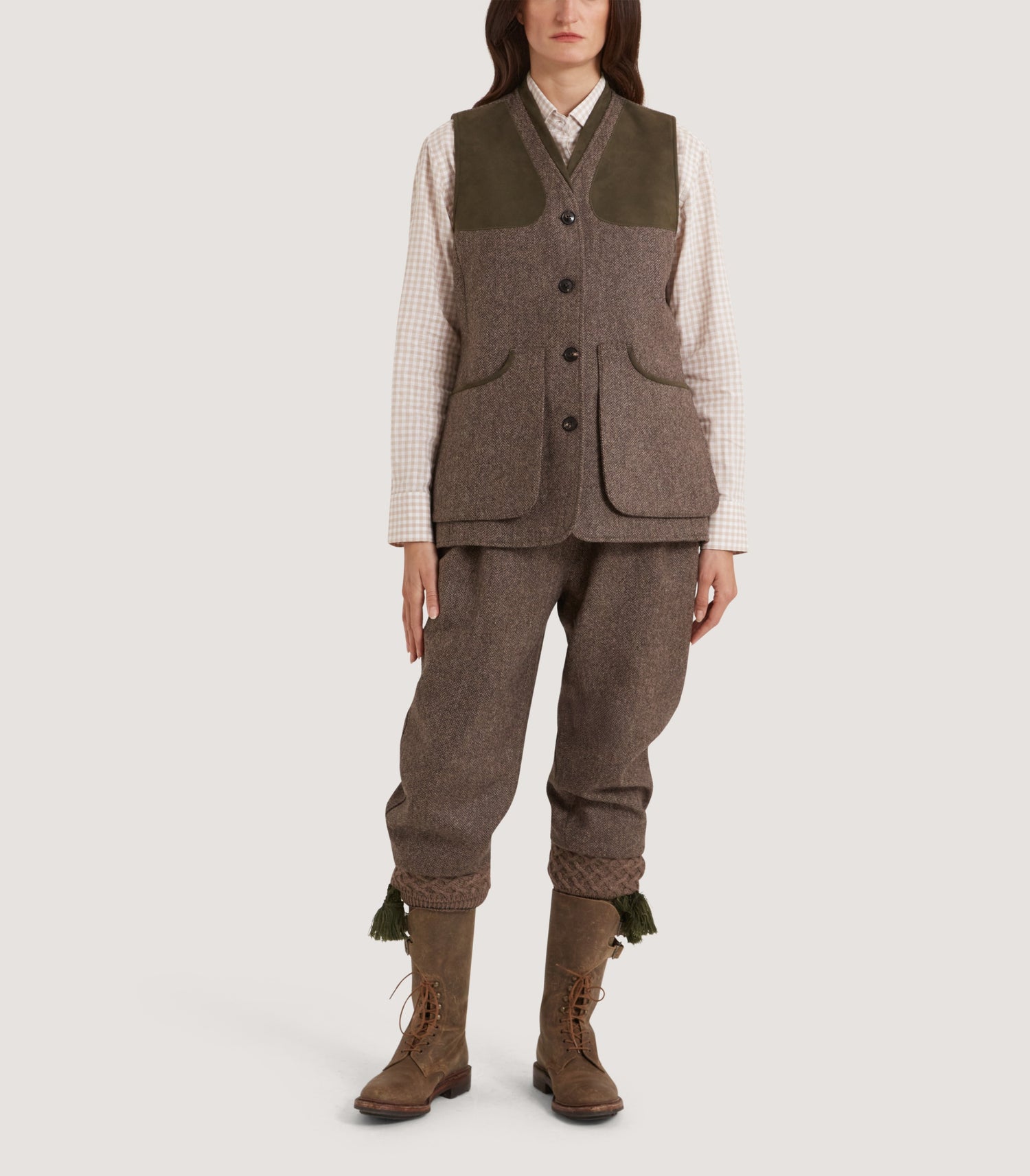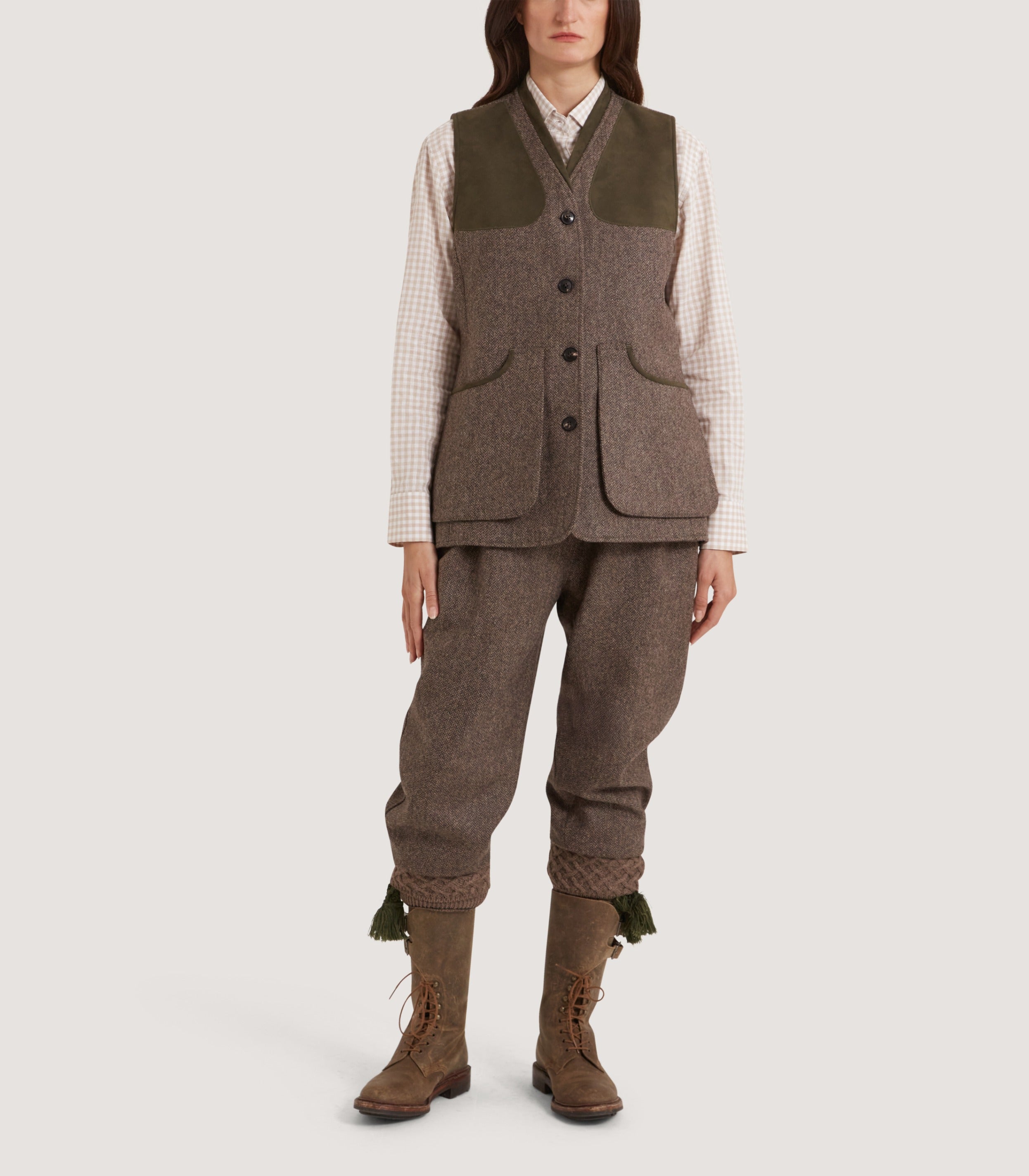 This classic shooting vest is crafted from lightweight wool tweed in the Heather colourway. It features shooting patches for enhanced grip and shoulder protection, and adjustable back tabs for a tailored fit.