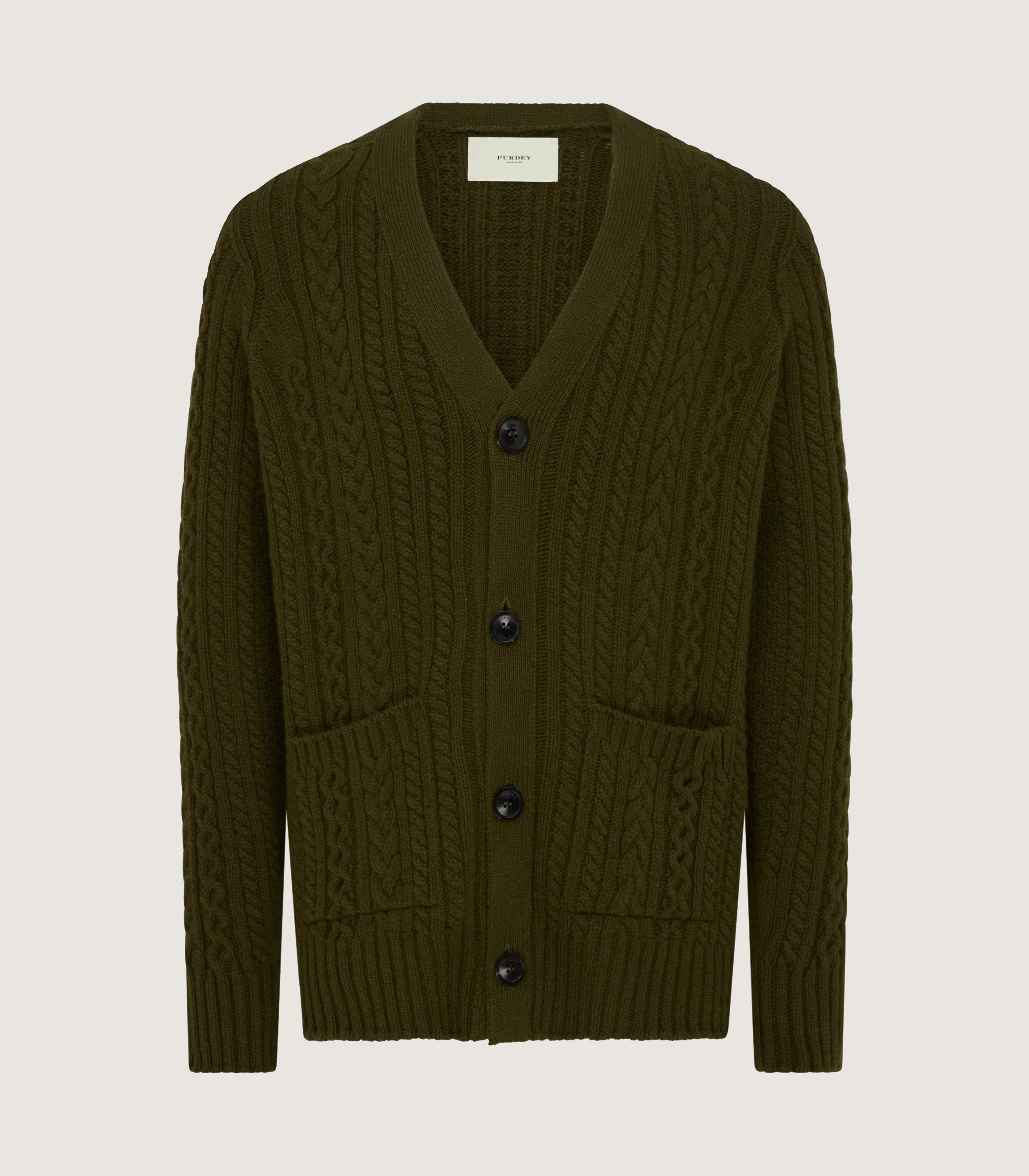 Men's Cashmere Cable And Rib V Neck Cardigan In Military