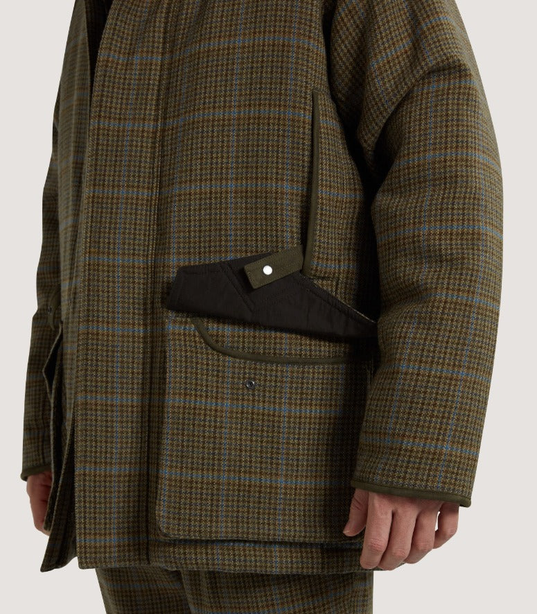 The highlight of our Tom Purdey tweed collection is our classic Field Coat. The Purdey Field Coat is a sophisticated take on a traditional design, crafted in Italy from luxurious 100% Scottish tweed. It's built for warmth and protection with a Sympatex drop liner membrane and HD wool wadding, making it ideal for chilly winter days. The coat features a quilted lining and sleeves, a large internal stow pocket, a zipped security pocket, and practical cartridge pockets. Details include a concealed snap front storm placket, a front zip closure, fleece-lined hand warmer pockets with retainer straps, a leather Purdey embossed tab, a clarino collar stand, and merino knitted inner cuffs. The coat is designed for a relaxed fit.