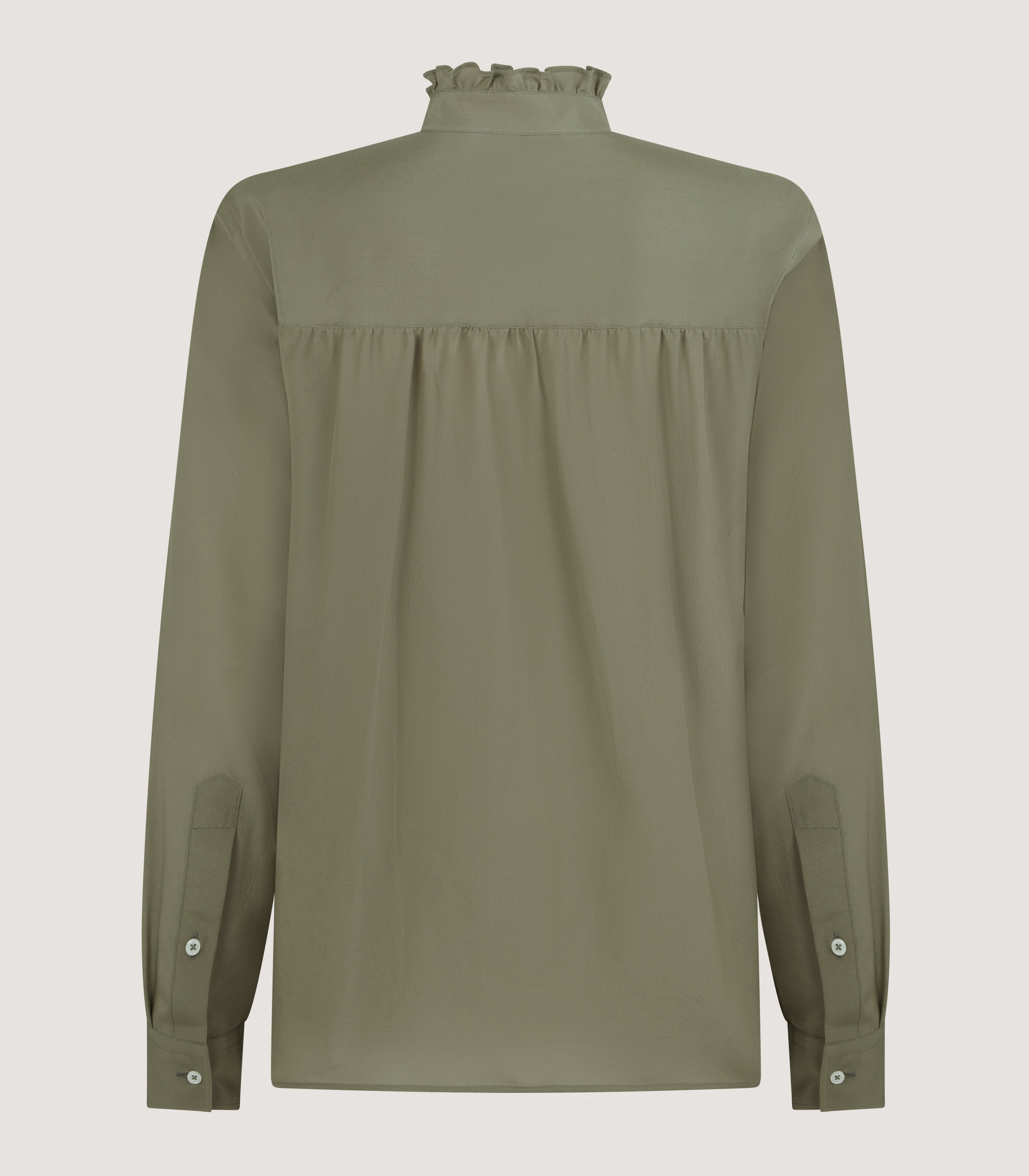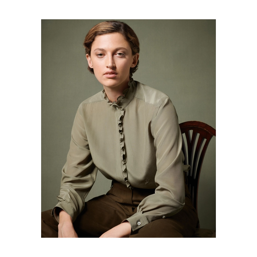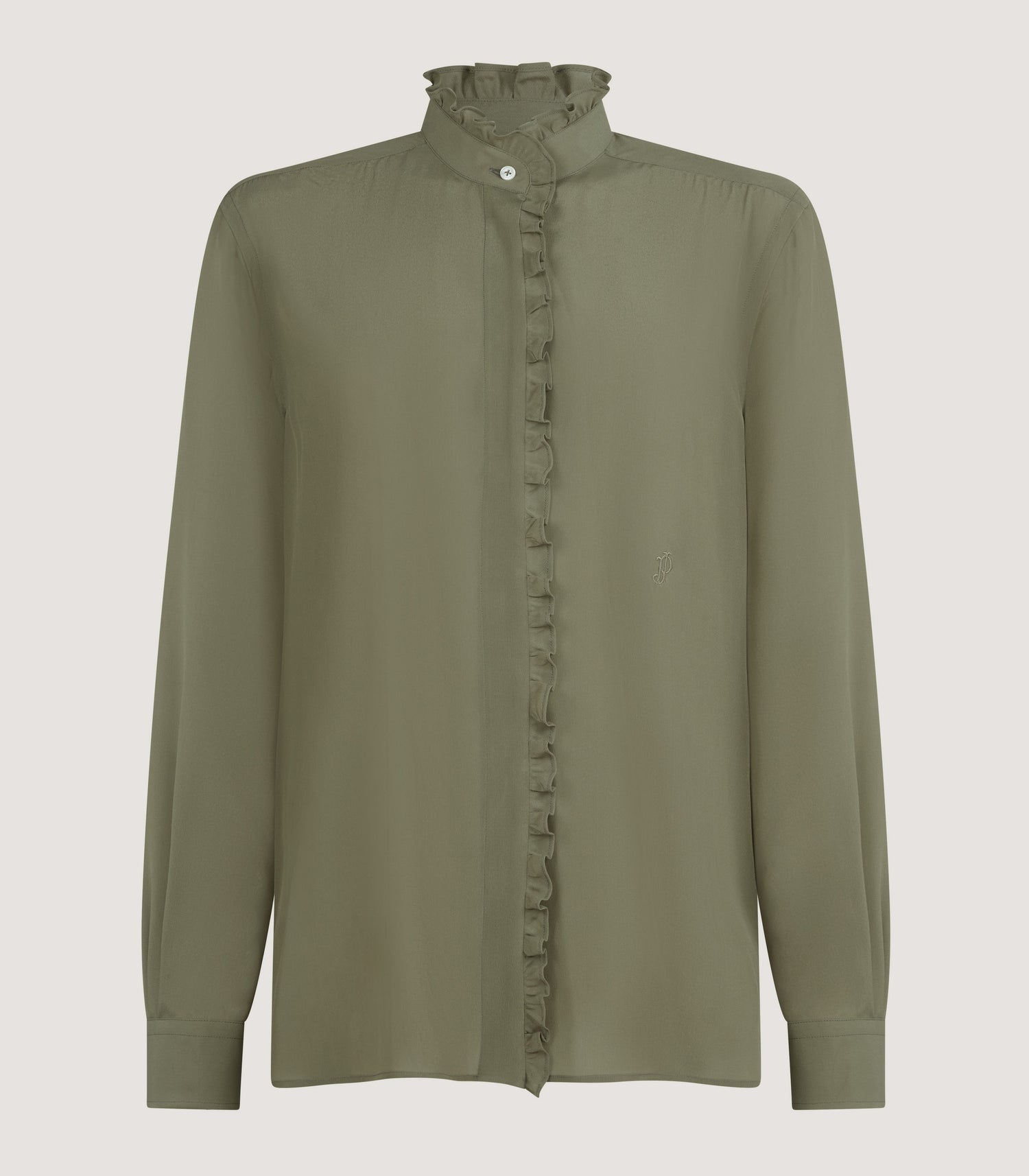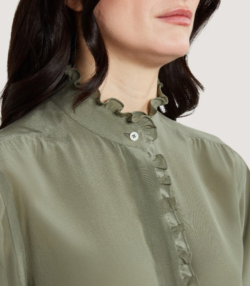 This elegant shirt is crafted in Italy from soft silk and features a delicate pie crust collar. Design details include elegant mother-of-pearl buttons and a versatile Sage Green colour.