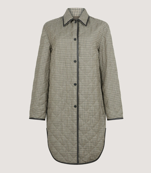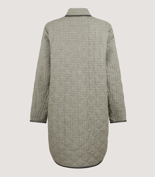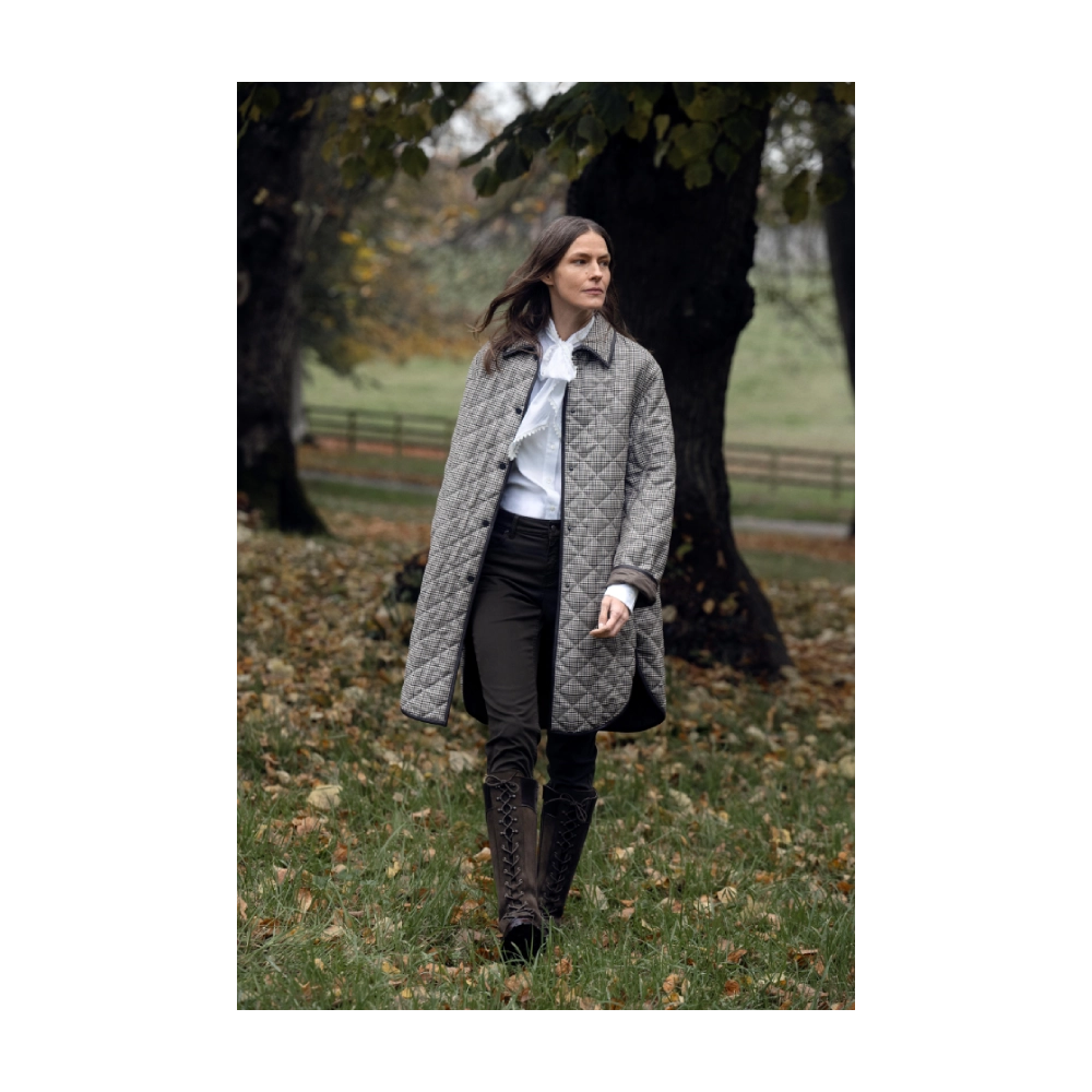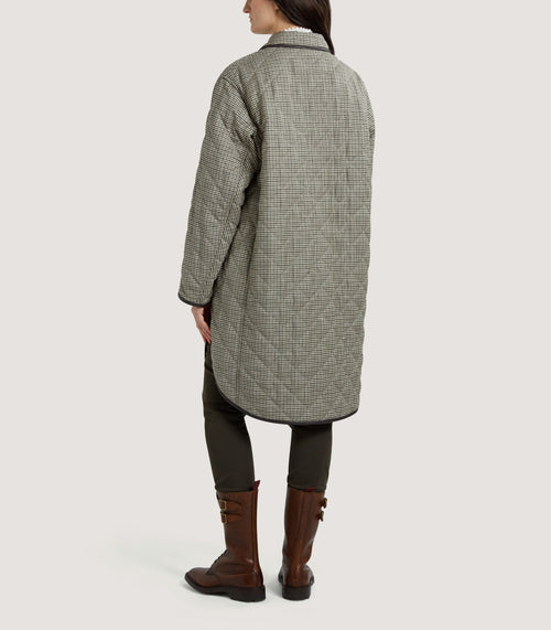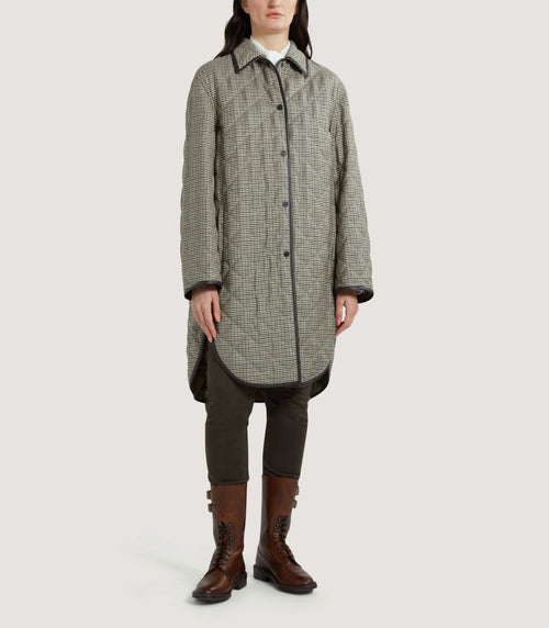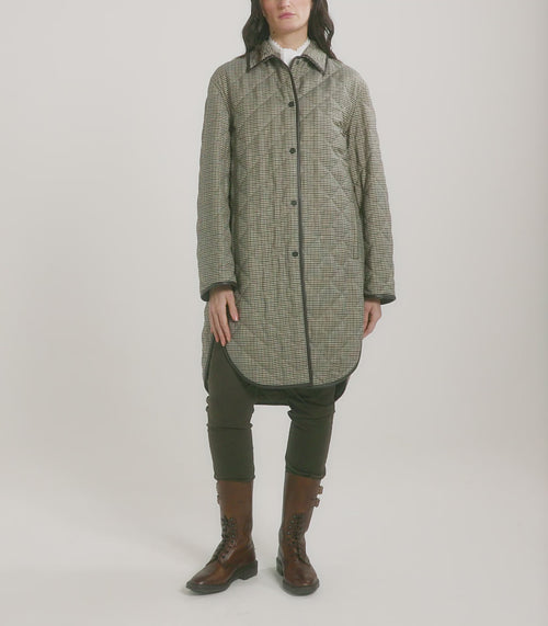 The Abbot is a women's long quilted coat that is ideal for walks on cold days highlighted by the extended back length. Made in Italy from 100% Khaki Green patterned wool with a 100% polyamide lining, it is quilted with HD Wool and features leather trimming.