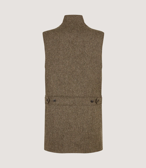 This classic shooting vest is crafted from lightweight wool tweed in the Acorn colourway. It features shooting patches for enhanced grip and shoulder protection, and adjustable back tabs for a tailored fit. Details include cartridge pockets, faux suede trim, and internal security pockets.