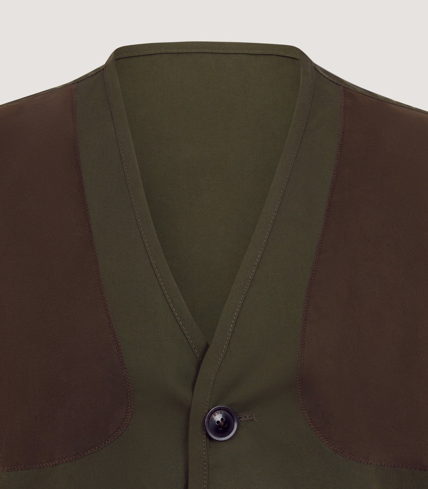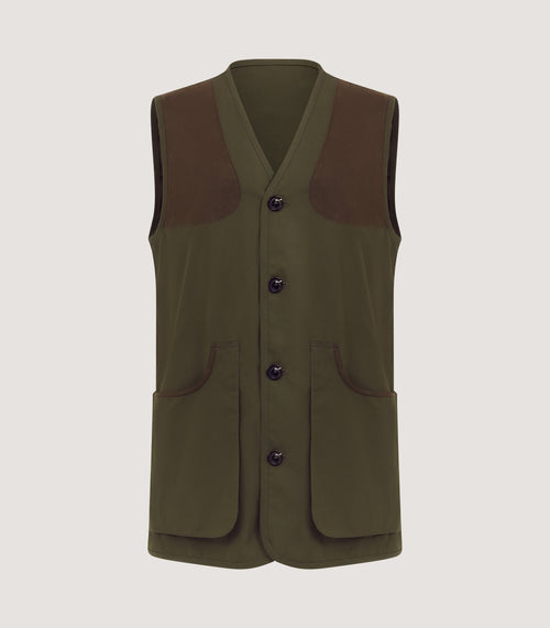 Our men's Dawson shooting vest is made in Portugal from 100% Cotton Ventile fabrication making it lightweight and breathable. It features Clarino shoulder patches and pocket opening trims, horn buttons, an inner buggy lining, and an inner patch pocket. Designed for a classic fit.