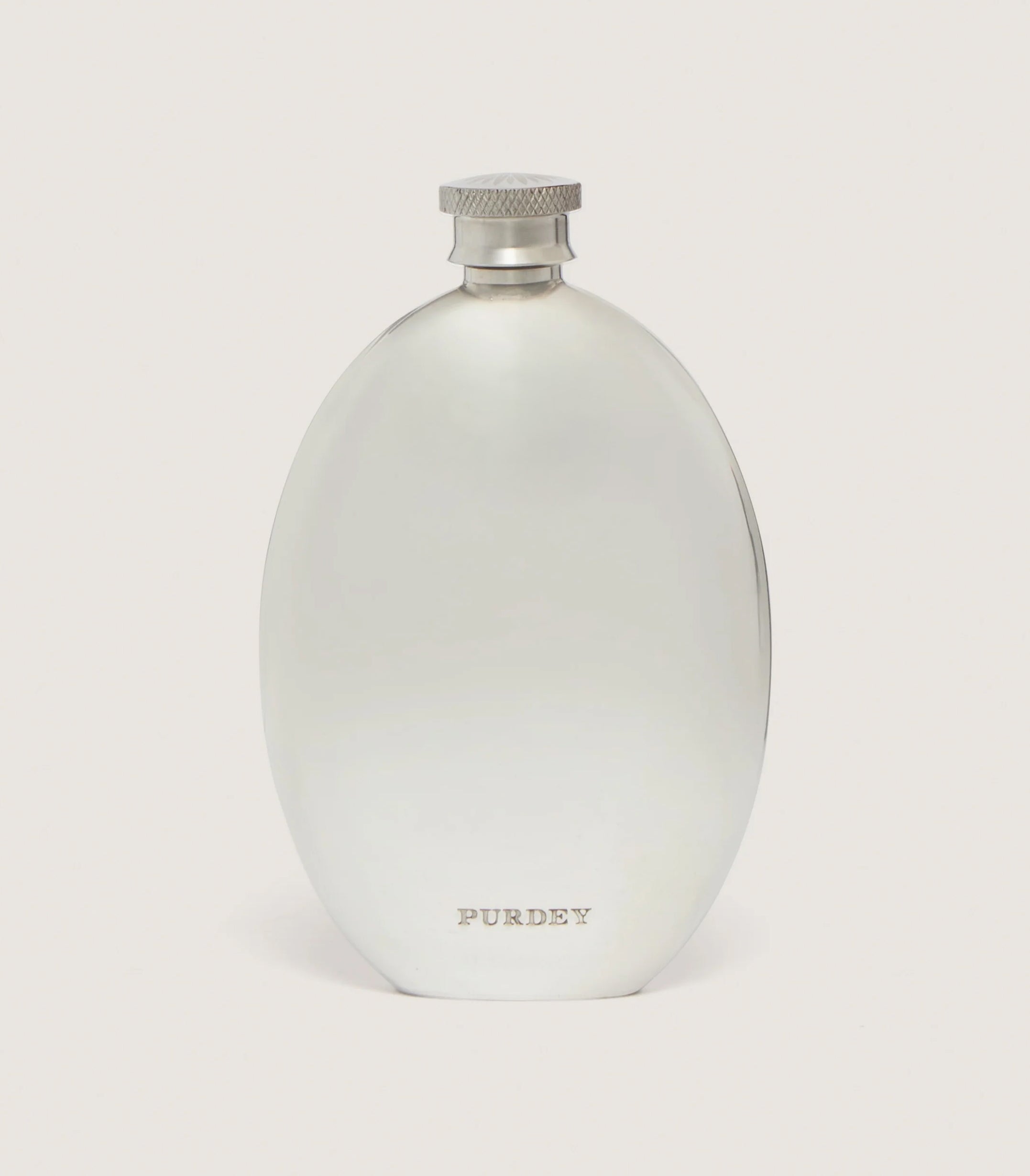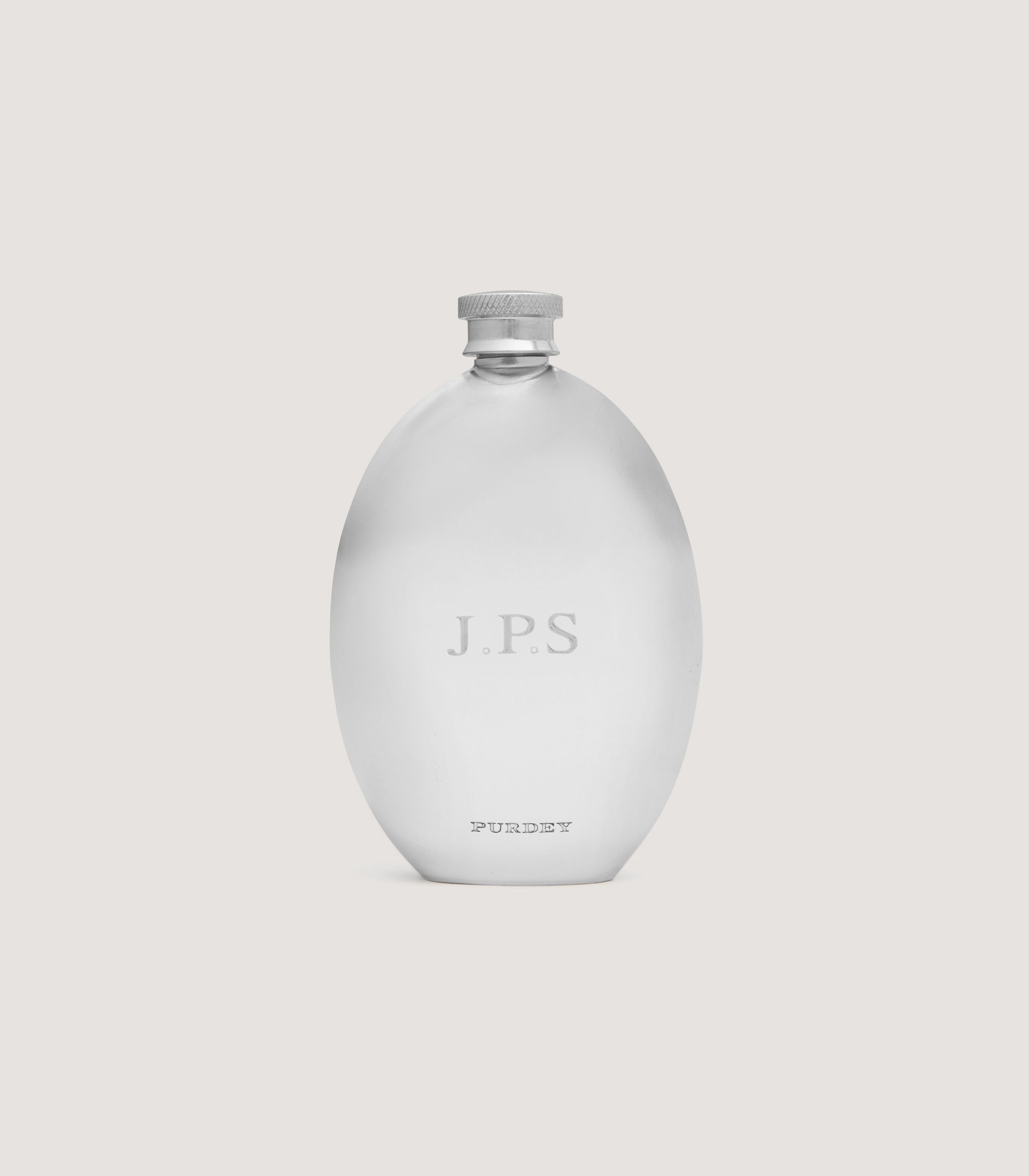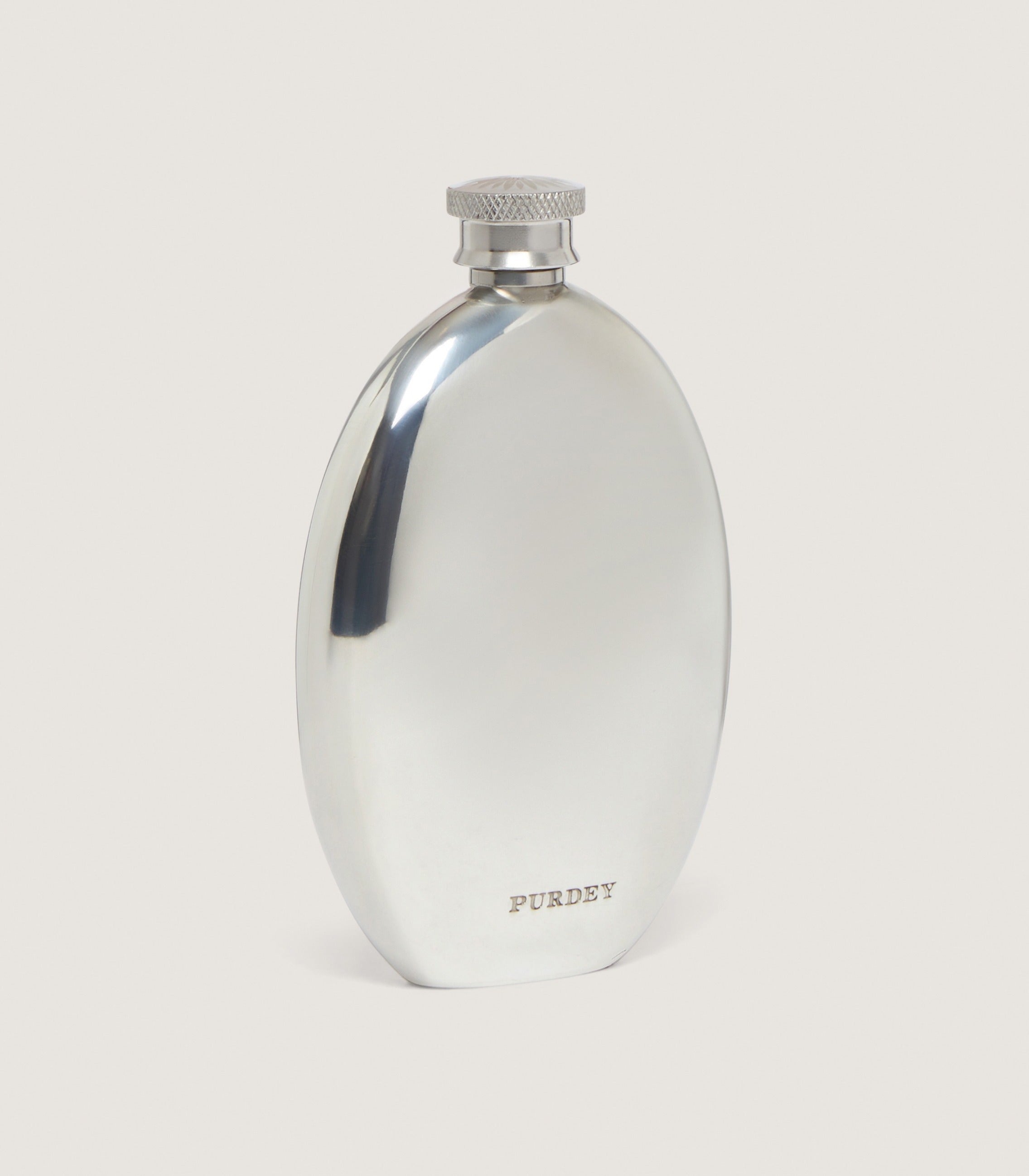 This neat pewter flask is the perfect size for a mid-sport sharpener. It has an engraved cap and Purdey engraved on the face with a capacity of 4.39 oz/125 ml.