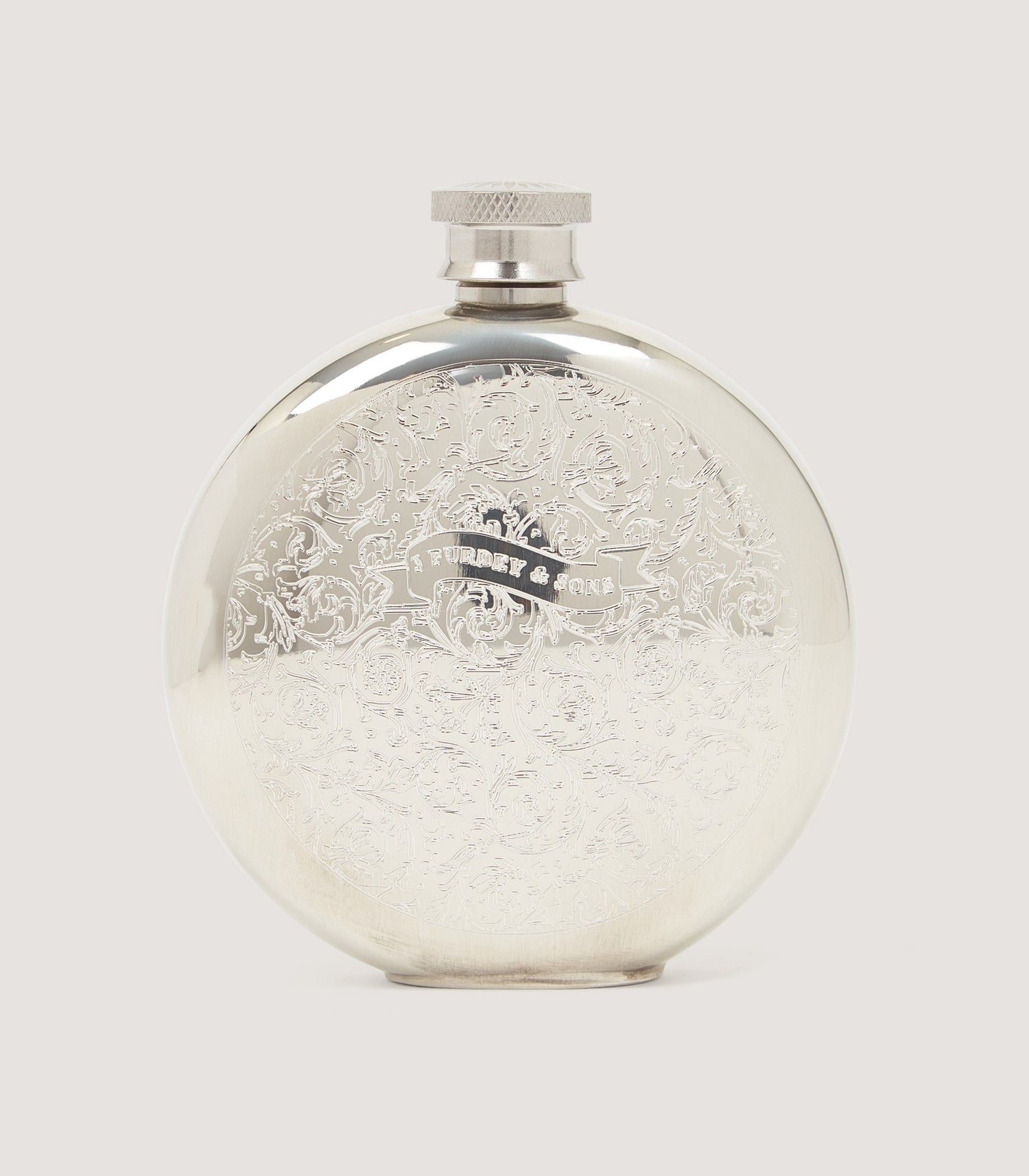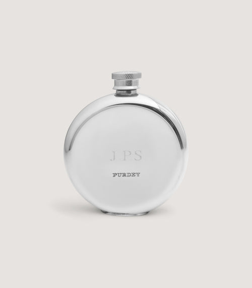 A round flask with screw top made from pewter and engraved with the trademark James Purdey & Sons rose and scroll seen on many a classic Purdey.