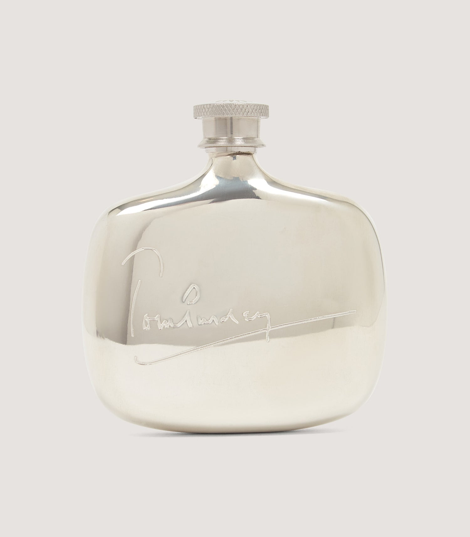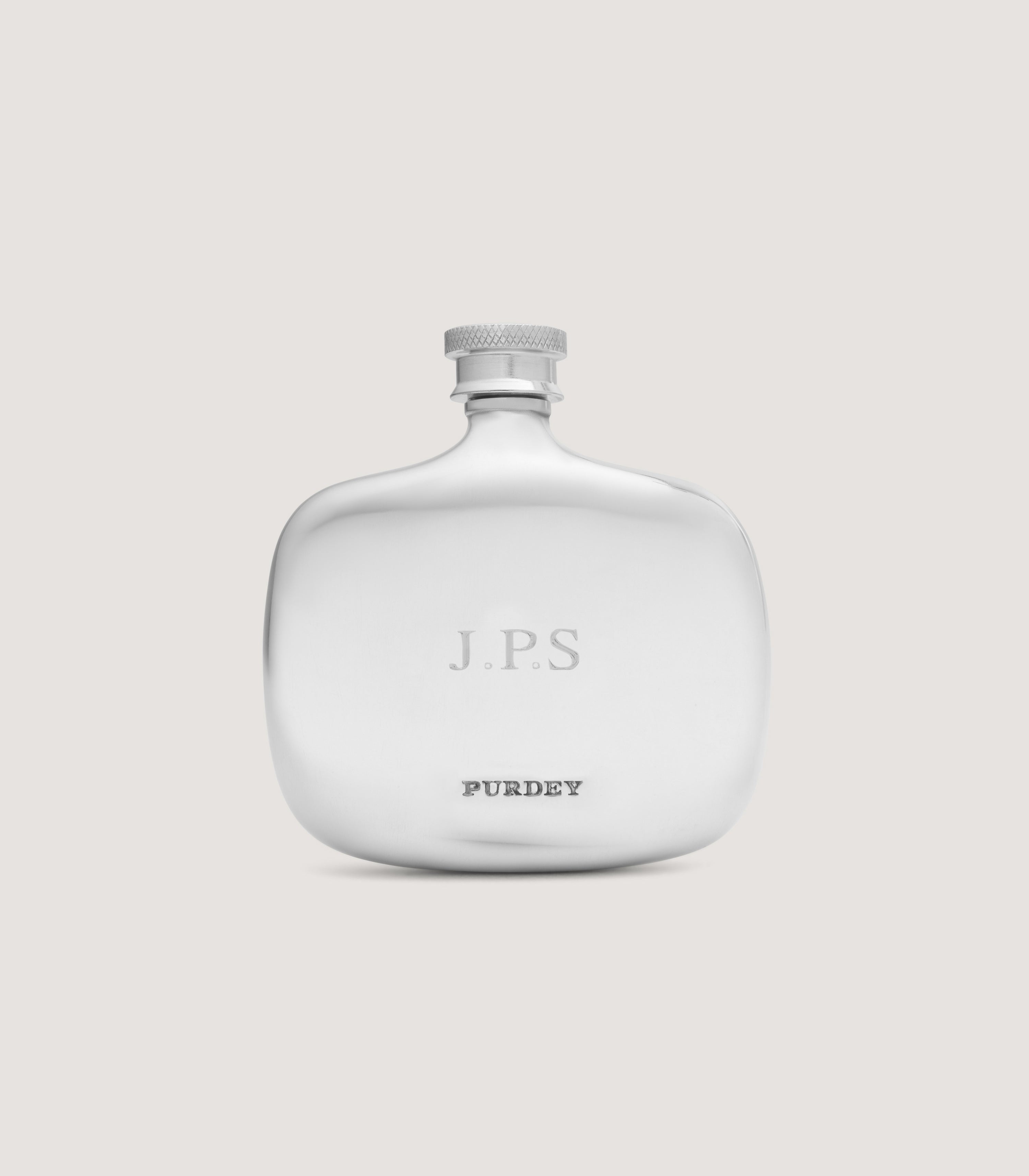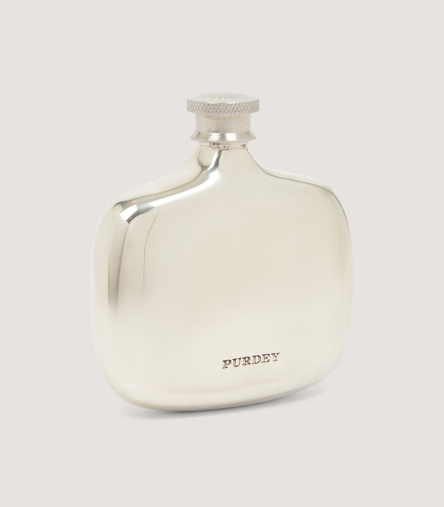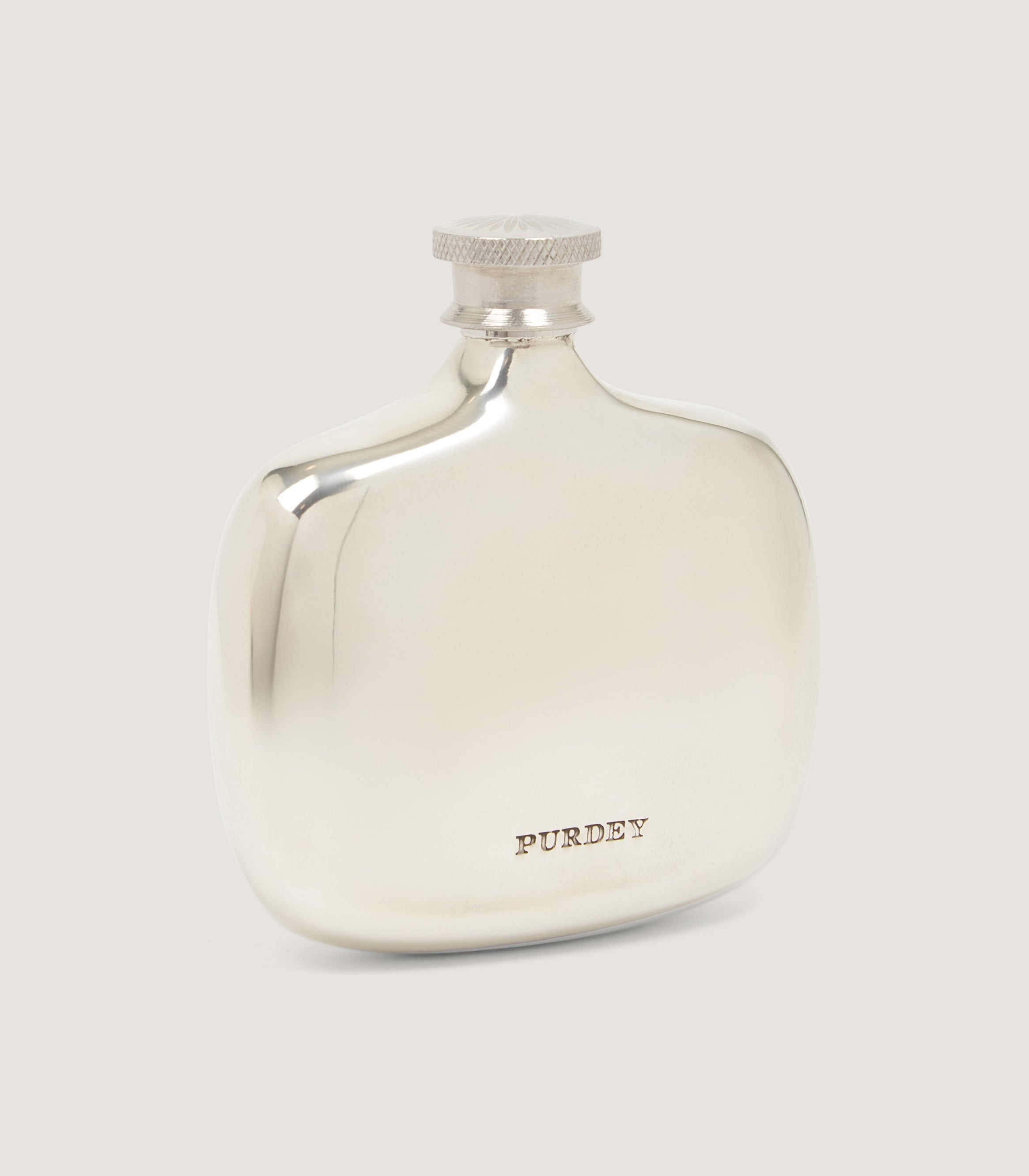 A tribute to Tom Purdey is a neat pewter flask with his signature engraved on the face. The perfect size for a mid-sport sharpener. It has an engraved featherburst cap and Purdey engraved on the back. 9.5cm x 8.5cm. Holds 85ml. Handmade in England.