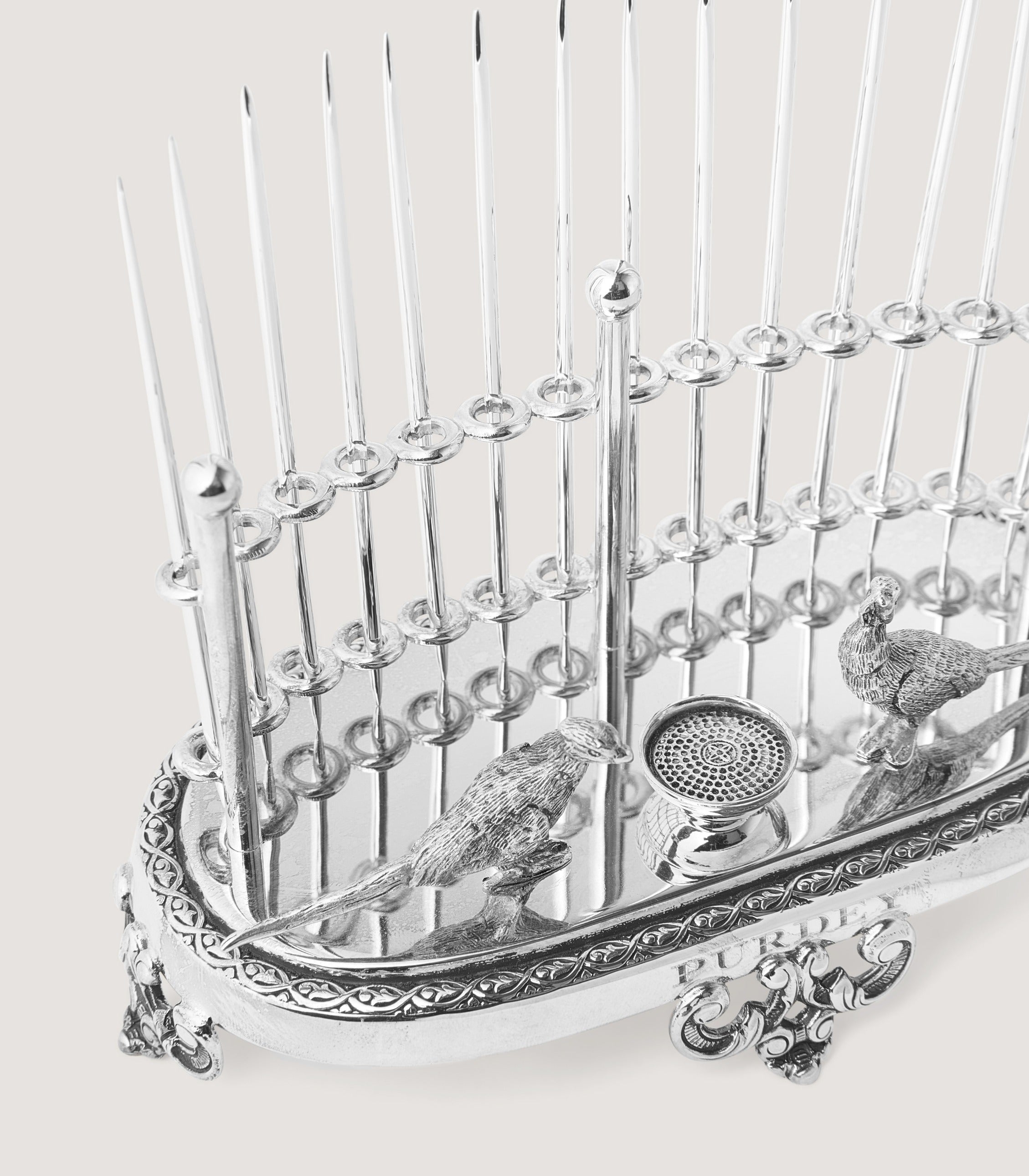 Our Pheasant Cocktail Stick Holder comes in 100% sterling silver and makes for an outstanding centre piece at your next dinner party. Cocktail sticks can be placed in the holes next to the pheasants.