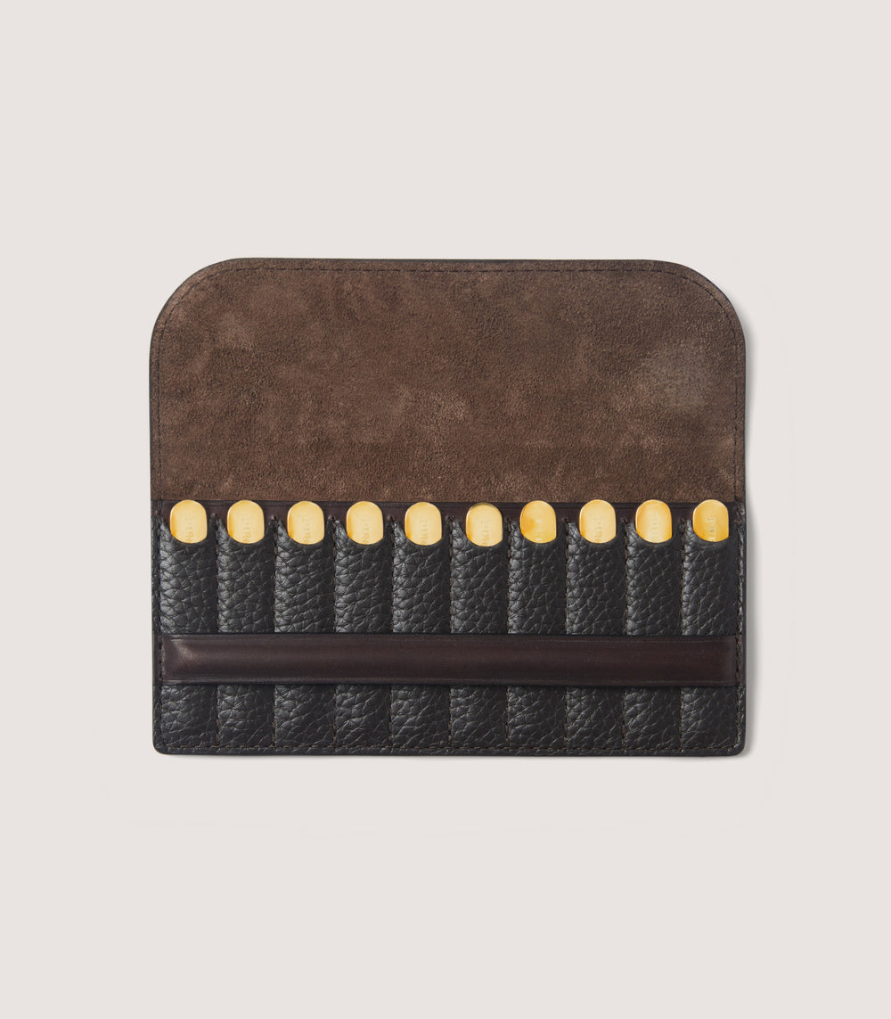 Made from grained leather, this wallet has an elongated position finder with a flap over and featherburst embossing at the front.