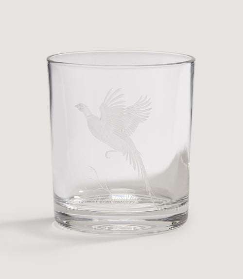 A crystal tumbler, intricately engraved by a master craftsman with a flying pheasant. 'Copper wheel' is the most demanding of all engraving processes and is particularly suited to pictorial subjects as the three dimensional and tactile surfaces convey both depth and form.  Made in the UK.