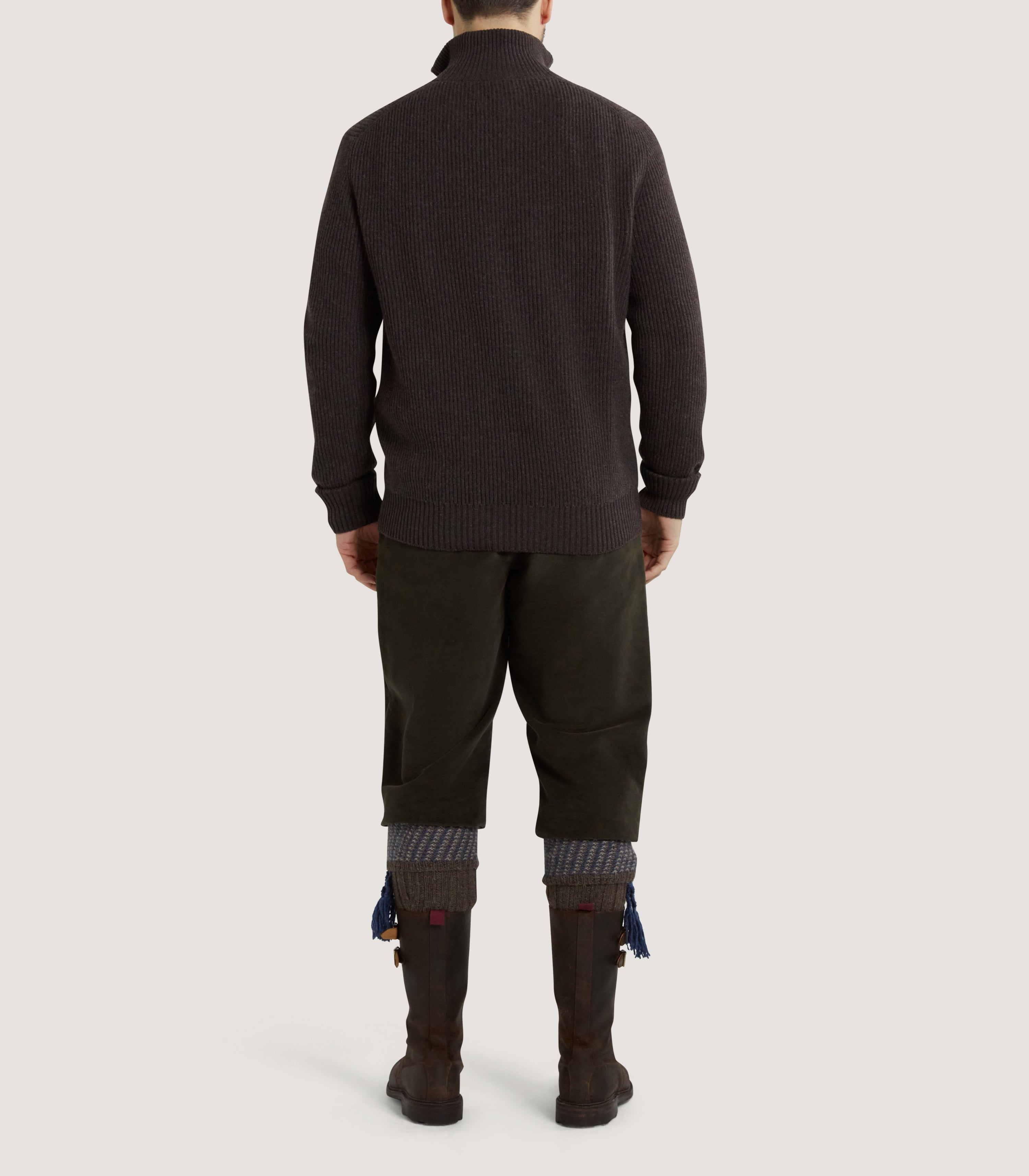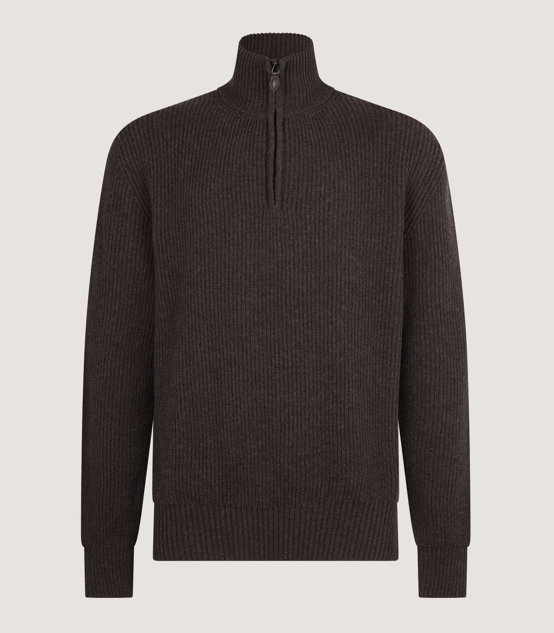 The Clifford is a luxurious ribbed quarter-zip sweater, featured here in Peppercorn, perfect for adding a touch of sophistication to your casual wardrobe. Crafted from a blend of 70% wool and 30% cashmere, this mock neck sweater offers a soft, warm, and comfortable feel. It features a 1/4 zip closure with a stylish leather zip puller, long sleeves, and all-over ribbed detailing. Made in Scotland with meticulous attention to detail, this regular fit sweater is designed for a comfortable and flattering silhouette.