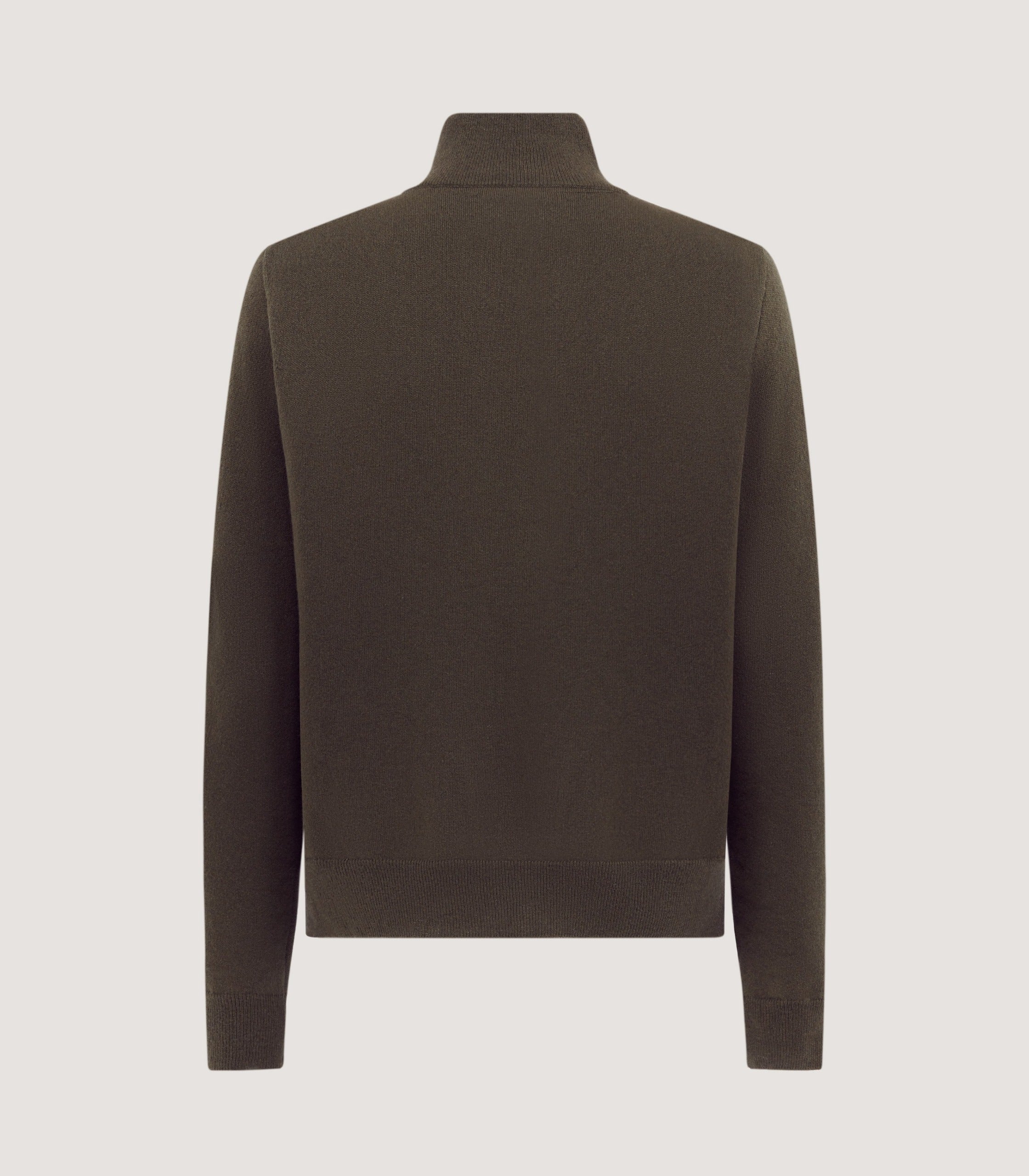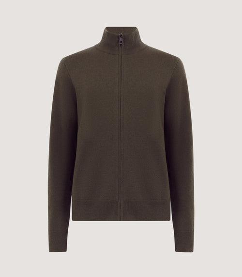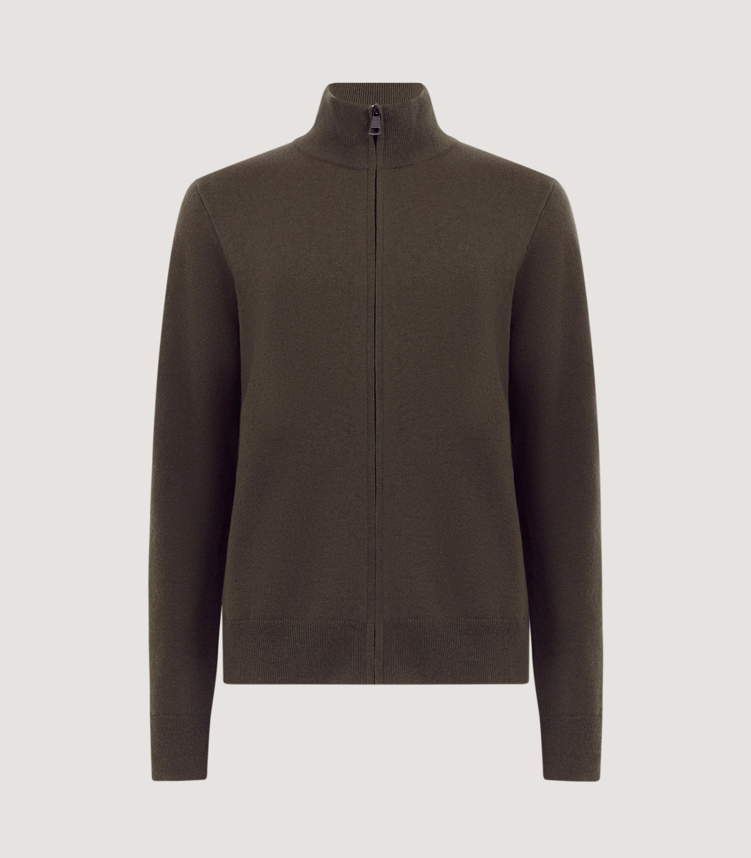 The Halkin, featured in our Loden Green colourway, is a sophisticated and versatile zipped cardigan perfect for adding a touch of modern yet practical style to your wardrobe. This double-layered technical cardigan features a mock neck, a zip at the centre front, long sleeves, loop back stitching at the inner, and ribbed neck, cuffs, and hem. Made in Italy from 100% wool, this regular fit cardigan offers both comfort and style.