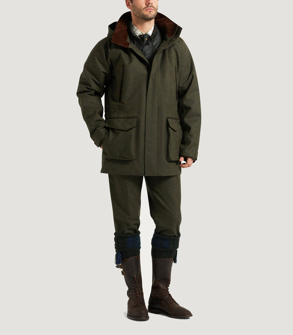 The Strathbeg is a Scottish tweed with a technical edge. It features a three-layer waterproof construction exclusively developed by Purdey meaning you'll stay dry no matter how extreme the weather becomes. The addition of nylon provides increased durability and a lighter material for active days out. An ideal choice for wet, windy and cold conditions such as the Scottish Highlands or the Welsh Valleys.
