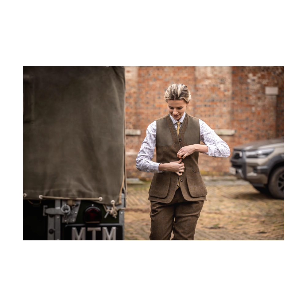 This classic shooting vest is crafted from 100% Scottish wool tweed in the Oakley colourway. It features a traditional high collar, shooting patches for enhanced grip and shoulder protection, and adjustable back tabs for a tailored fit.