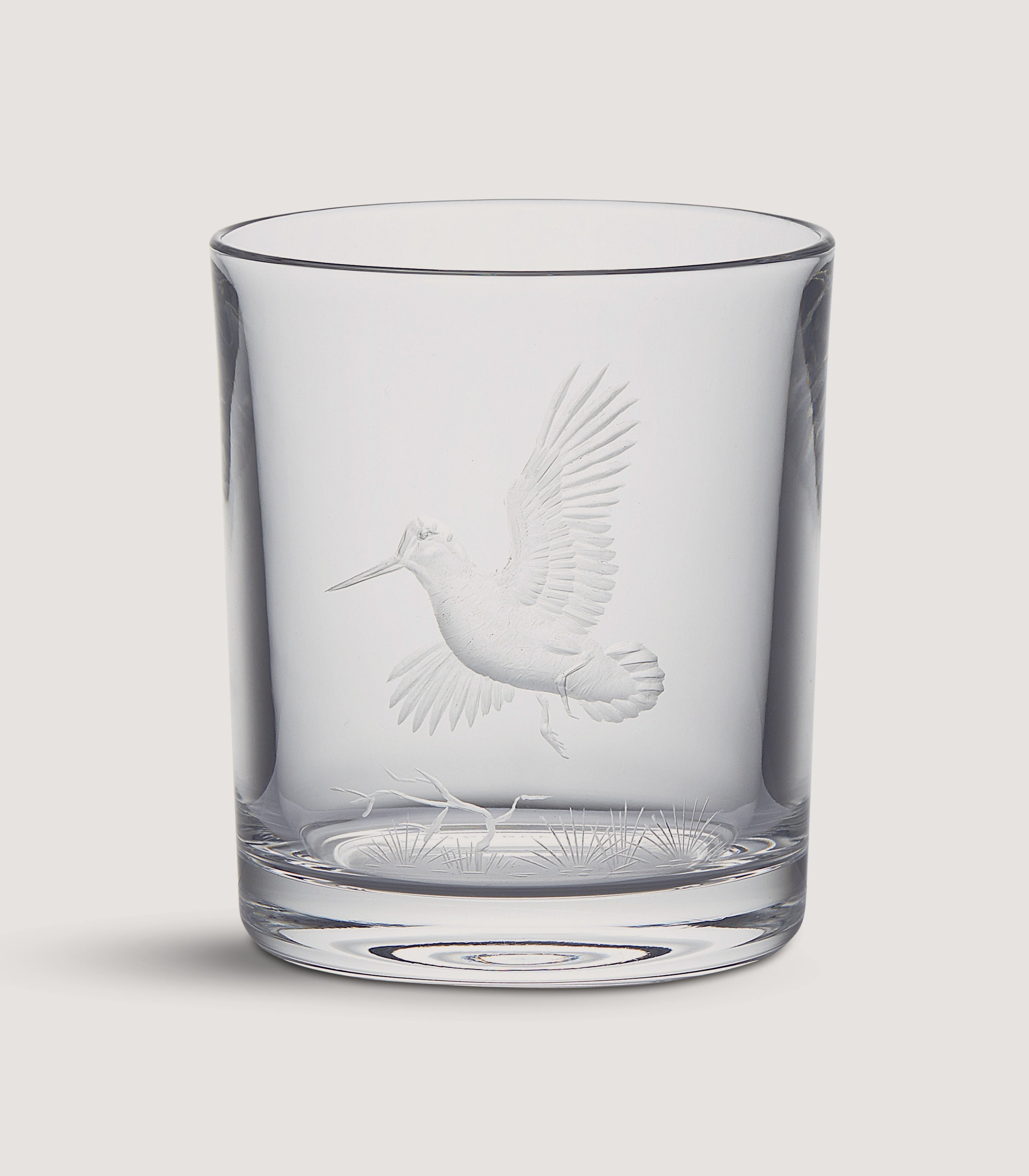A crystal tumbler, intricately engraved by a master craftsman with a flying woodocock. 'Copper wheel' is the most demanding of all engraving processes and is particularly suited to pictorial subjects as the three dimensional and tactile surfaces convey both depth and form.  Made in the UK.