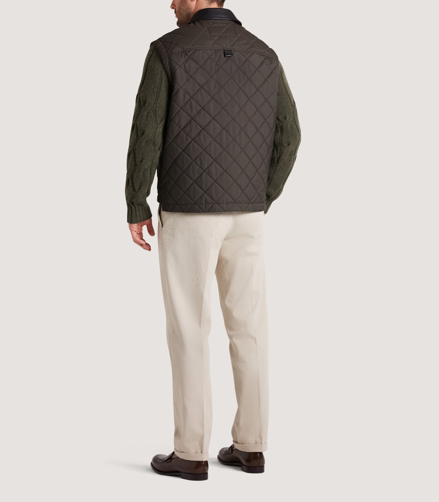 The Men's Padded Barn Gilet is made from a silk fabric mix, with a windproof laminated back. It features a large diamond effect quilting achieved through UK-sourced HD wool.